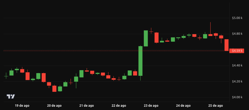 Tras aumentar 7% en la última semana, el precio actual de ETH ronda los 4,590 dólares, en una zona de soporte relevante. El gráfico refleja una tendencia aún constructiva, aunque presionada por la corrección reciente.