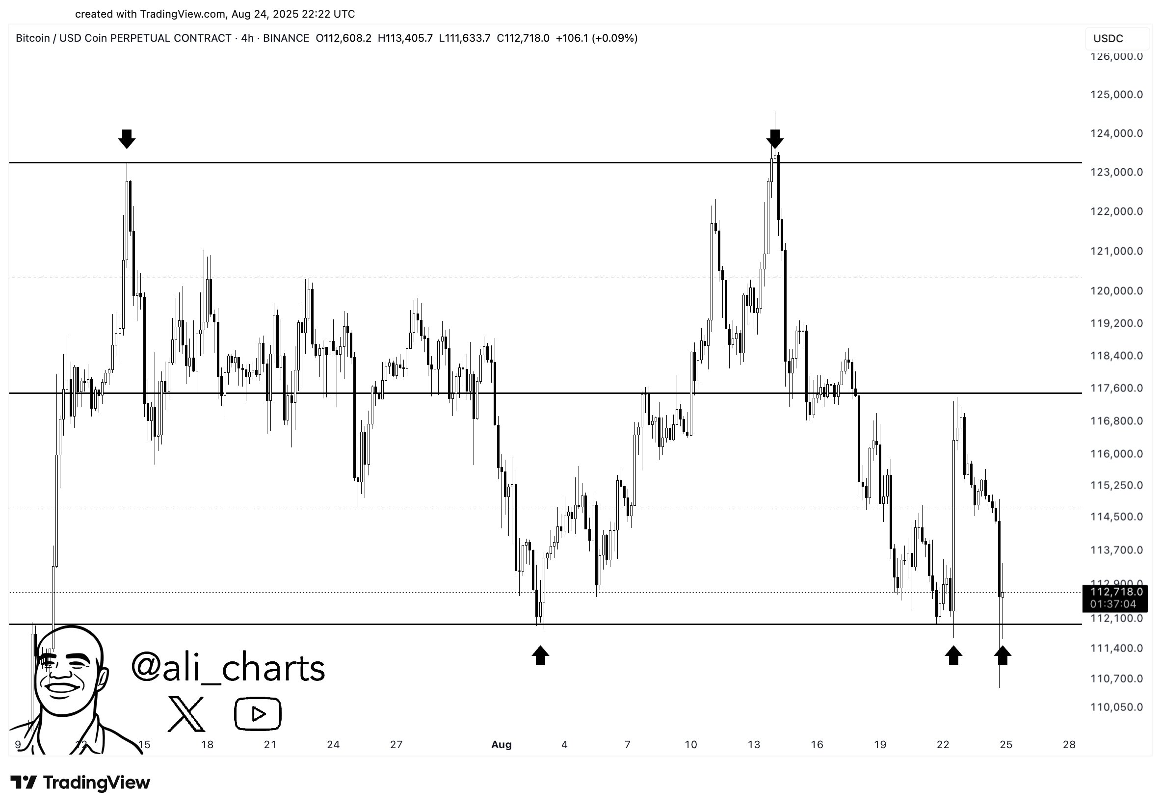 Martinez define mantener un cierre por encima de $112,000 como el requisito mínimo para la recuperación de Bitcoin. Según el gráfico de cuatro horas que compartió, el fondo de $112,000 ha sido probado múltiples veces, con $117,600 sirviendo como un nivel intermedio y alrededor de $123,000 como la banda superior. El gráfico sugiere que defender este nivel inferior podría llevar el precio hacia el rango de $120,000.