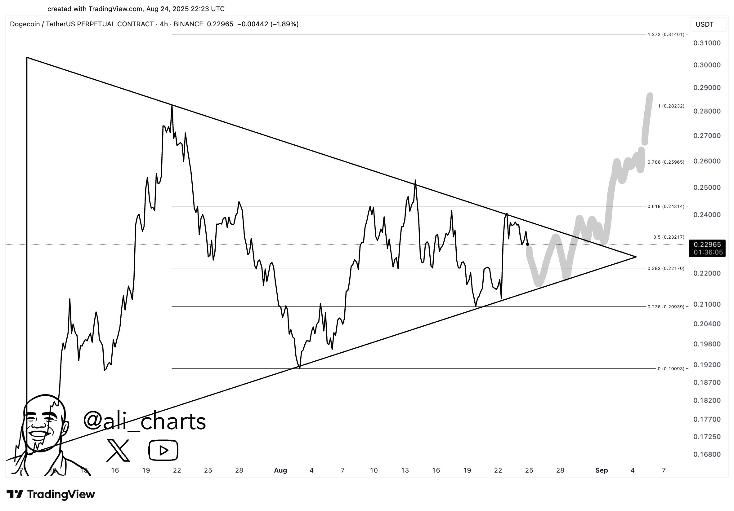 En cuanto a Dogecoin, Martinez destaca una formación de triángulo en el gráfico, sugiriendo una posible caída antes de una ruptura. Tras este descenso a corto plazo, prevé una resolución ascendente de la tendencia. El gráfico muestra niveles de Fibonacci de 0.5–0.618, con el movimiento de precio confinado a medida que se aproxima a la línea superior del triángulo.