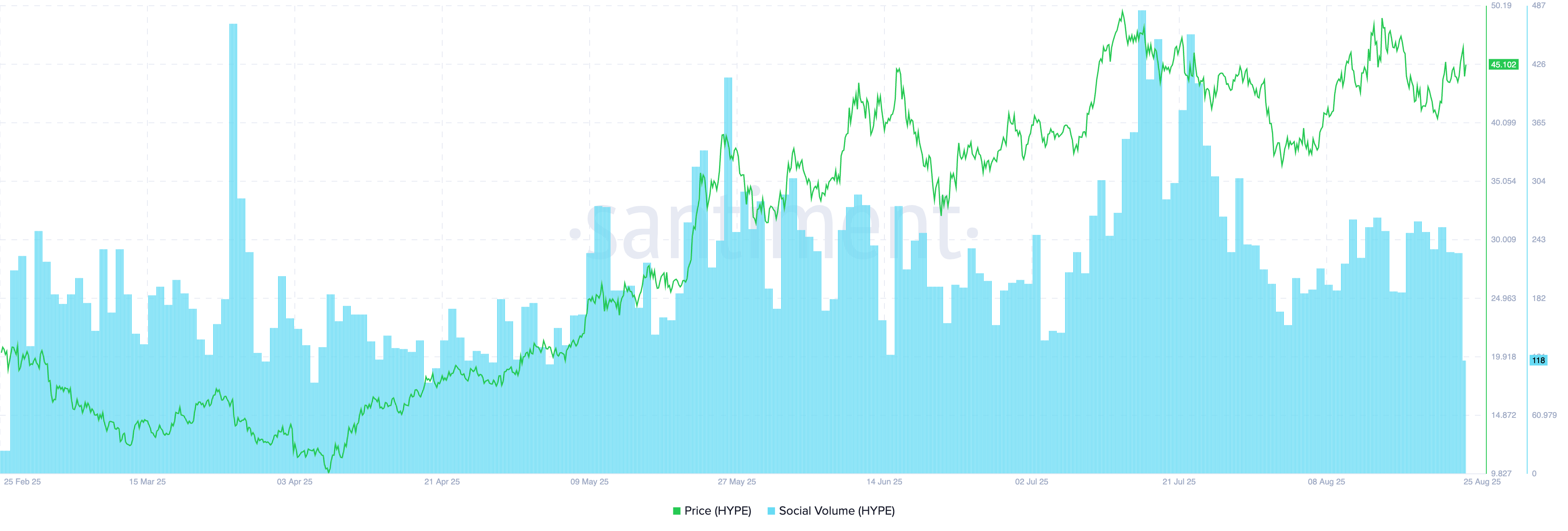 El gráfico de volumen social de Santiment a continuación destaca un aumento en las menciones de HYPE en diferentes plataformas de redes sociales. Los aumentos constantes en esta métrica, que se mantienen relativamente bajos pero por debajo de los niveles máximos de julio, se alinean con el crecimiento de la demanda minorista. Los operadores deben estar atentos a posibles picos en el volumen social, que a menudo señalan posibles aumentos de precios.