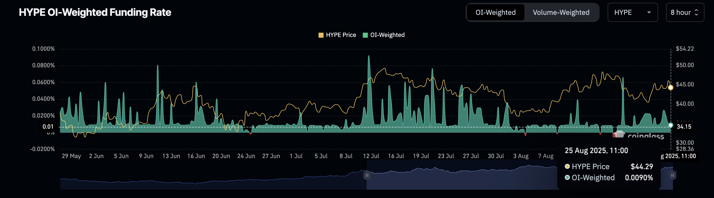 Este aumento sostenido en el OI sugiere que más operadores están apostando por aumentos de precios a corto plazo. Sin embargo, los operadores deben proceder con precaución ya que la tasa de financiación de futuros ha disminuido al 0,0090% después de alcanzar un máximo de 0,0663% el 18 de agosto. En otras palabras, menos operadores están apalancando posiciones largas en HYPE, lo que podría disminuir el sentimiento positivo del mercado.