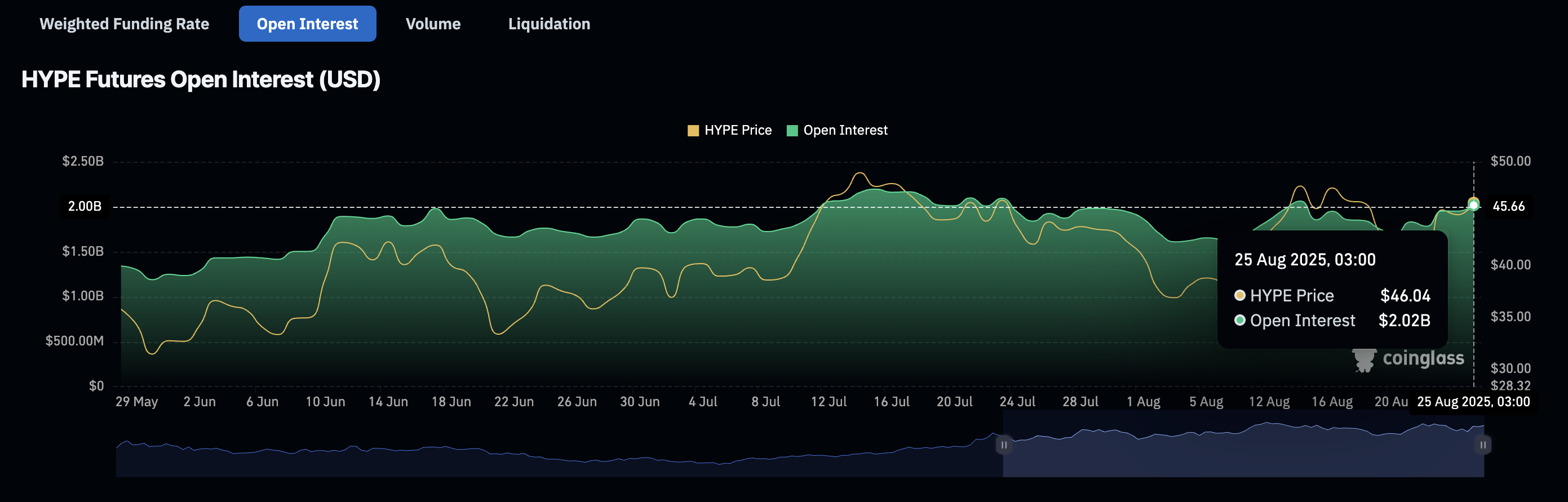 Hyperliquid muestra signos de una recuperación sostenible hacia su máximo histórico cerca de la marca de 50,00$, impulsada por el aumento de la demanda minorista. Según los datos de CoinGlass, el OI de futuros de HYPE, que se refiere al valor nocional de los contratos de futuros u opciones pendientes, ha estado aumentando y estabilizándose por encima de los 2.000 millones de dólares a pesar del sentimiento generalizado de aversión al riesgo.