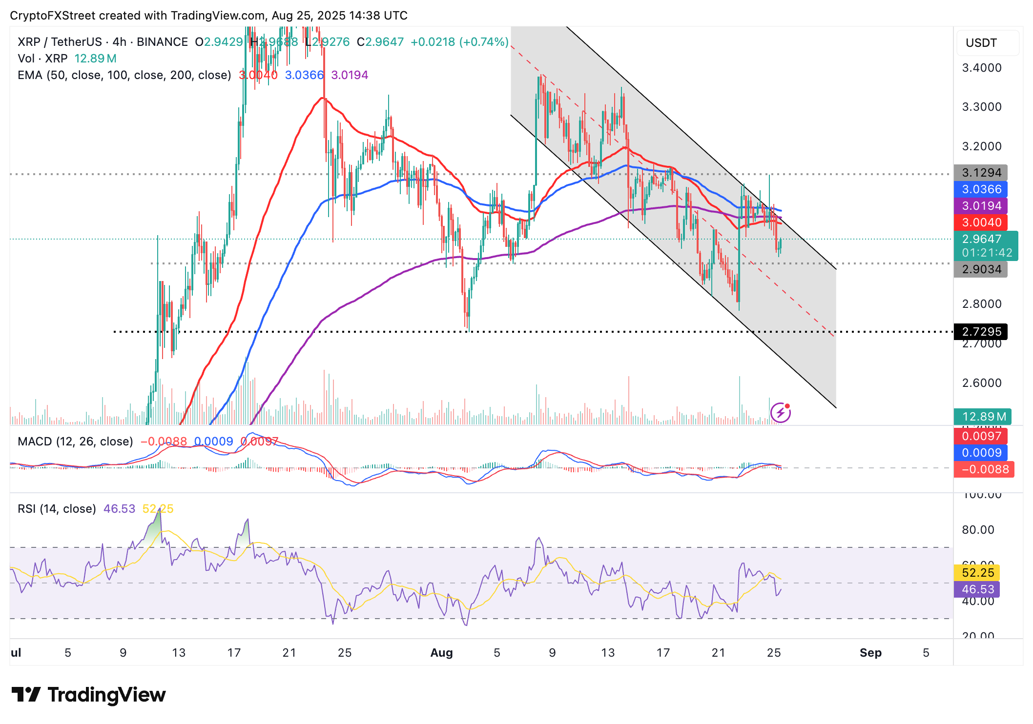 XRP se está negociando por encima de su soporte a corto plazo en 2.96$ mientras imprime otra vela verde de 4 horas. Una recuperación por encima de 3.00$ podría abrir la puerta a ganancias hacia el máximo histórico de XRP de 3.66$.