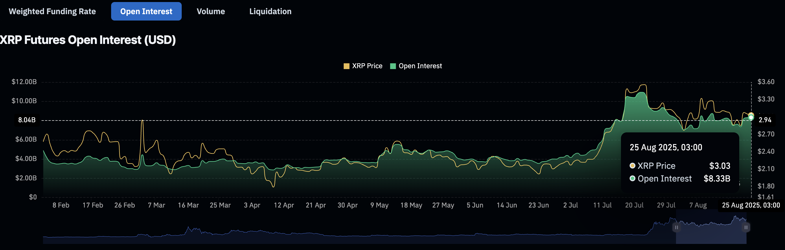 El interés en XRP se mantiene relativamente estable, como lo muestra el dato de Interés Abierto (OI) de futuros de CoinGlass, que promedió 8.33 mil millones de dólares en el momento de escribir este artículo. Un aumento constante en el OI, que representa el valor nocional de los contratos de futuros y opciones pendientes, subraya el sentimiento positivo del mercado.
