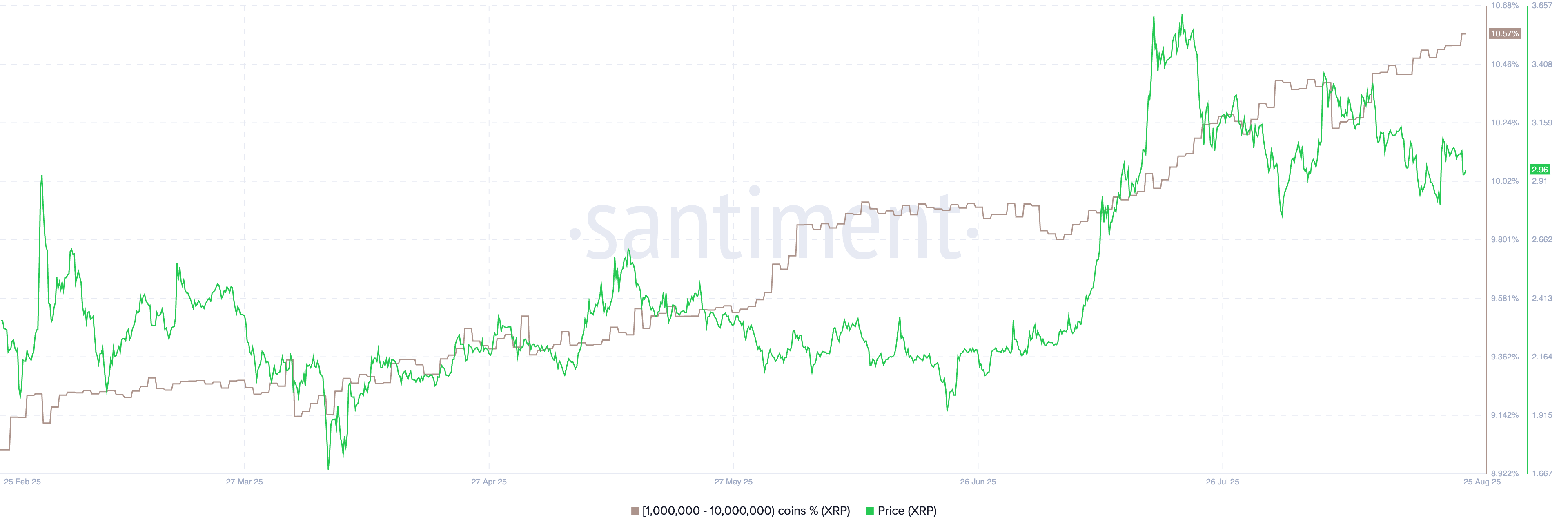 Según los datos de Santiment, las direcciones que mantienen entre 1 millón y 10 millones de XRP han crecido para poseer aproximadamente el 10.6% del suministro total, desde el 9.8% a principios de julio y el 9.14% a principios de marzo.
