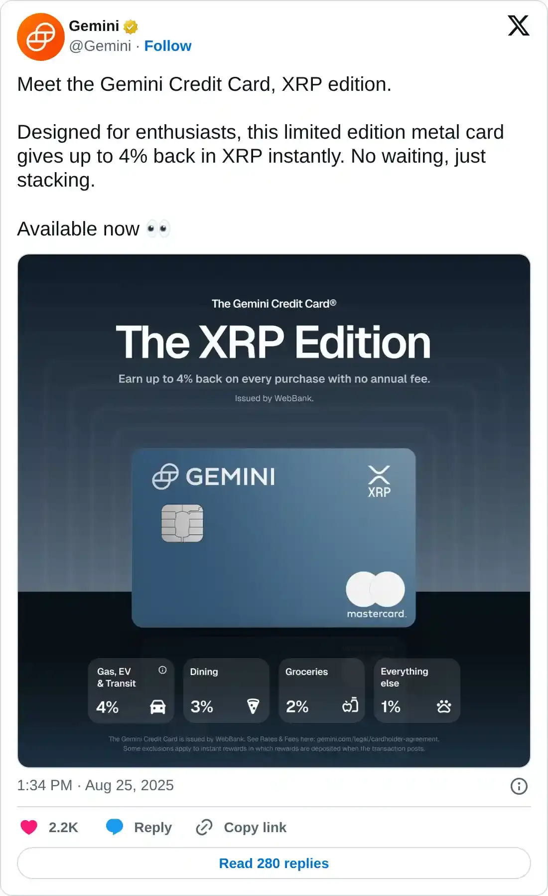Gemini, la plataforma de criptomonedas fundada por los gemelos multimillonarios Cameron y Tyler Winklevoss, ha lanzado una tarjeta de crédito XRP en colaboración con Ripple. Según CoinDesk, la tarjeta es emitida por WebBank y se asemeja a otras tarjetas de reembolso de Gemini. Los titulares de la tarjeta son elegibles para recompensas de hasta un 4% en XRP en compras seleccionadas como combustible, carga de vehículos eléctricos (EV) y servicios de transporte compartido.