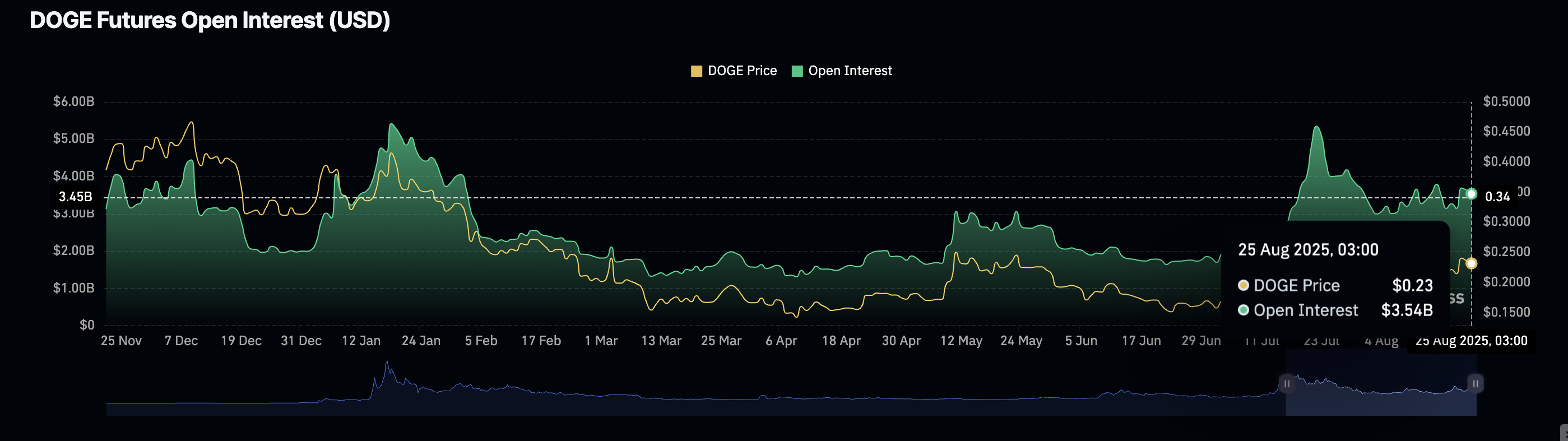 El interés en DOGE sigue siendo inestable según los datos de derivados. El Interés Abierto (OI) de futuros ha bajado a 3.54 mil millones de dólares después de alcanzar un pico de aproximadamente 5.35 mil millones de dólares el 22 de julio. Una disminución constante en el OI implica un sentimiento de mercado débil, resultando en menos operadores apostando por aumentos de precios a corto plazo.