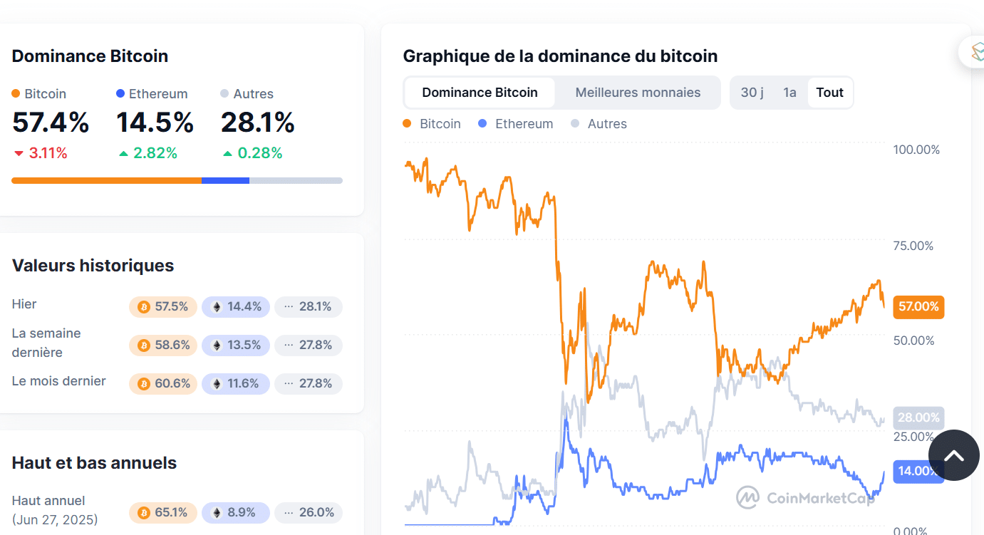 En agosto, Ethereum alcanzó un 14,98 % de dominancia, su máximo desde septiembre de 2024, acompañado de un récord histórico. Al mismo tiempo, bitcoin retrocedió al 58,2 %, su mínimo desde enero de 2025. Este cambio refleja una reasignación de capital dentro del mercado crypto: las ballenas, principalmente en Binance, acumulan ahora ETH, confirmando que Ethereum ya no es un simple segundo papel, sino un verdadero activo de crecimiento frente a bitcoin, siempre percibido como valor refugio.