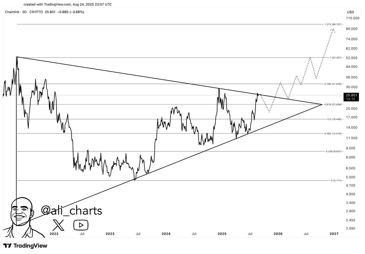 Ali Martinez, a través de un gráfico reciente, destacó que LINK Coin podría apuntar a cifras triples, pese a las caídas a corto plazo. Para lograr esto, LINK debe cerrar por encima del rango actual de $25-$27. Tras estos cierres, se anticipa una subida a $30, progresando a $52 y alcanzando finalmente los $100.