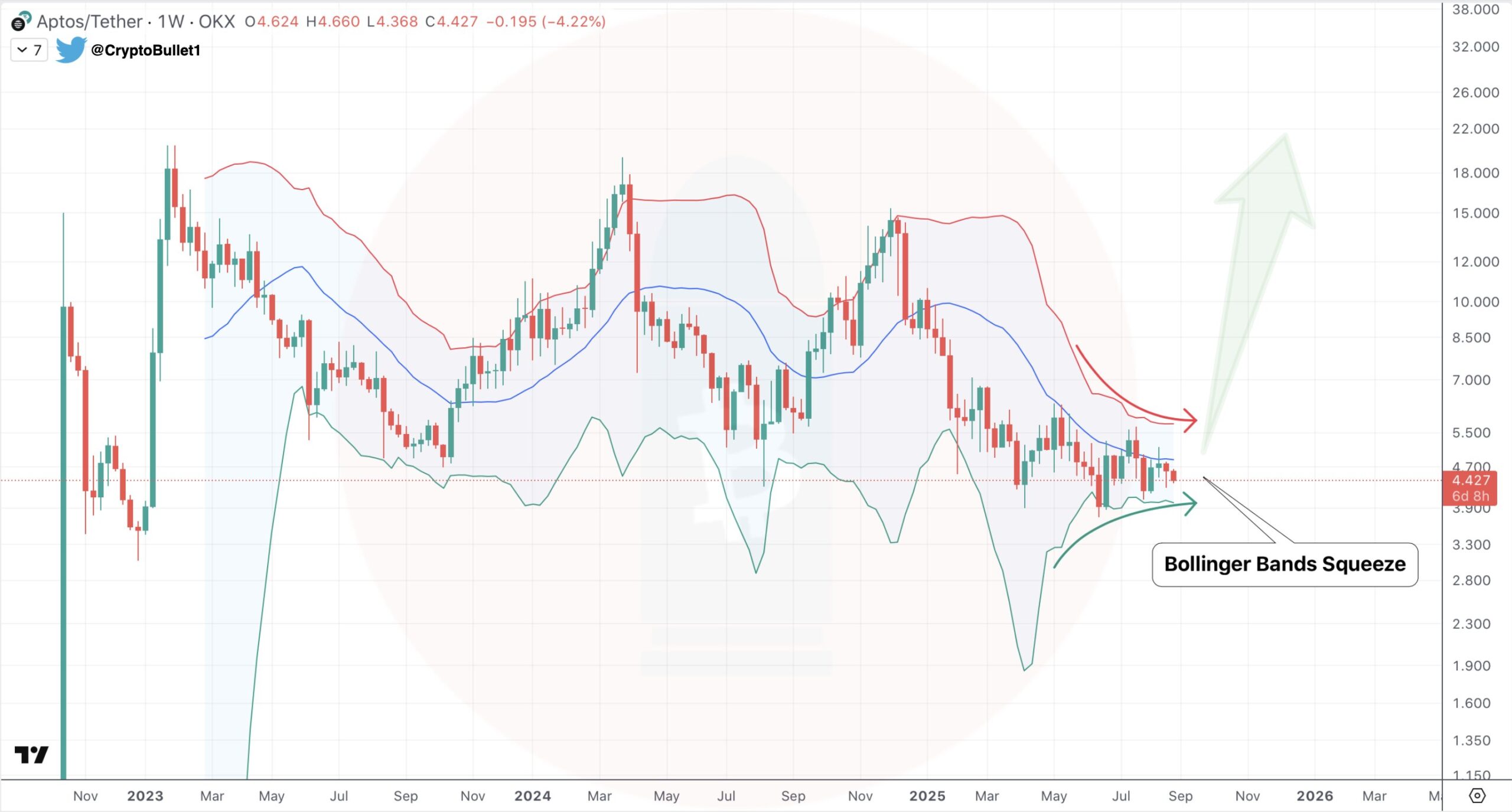 Un analista conocido como CryptoBullet llamó la atención sobre Aptos (APT) Coin, un competidor de Solana que ha estado a la sombra recientemente. Observó una contracción en las Bandas de Bollinger en el gráfico semanal de APT, señalando un posible crecimiento explosivo una vez que supere la línea media de las Bandas.