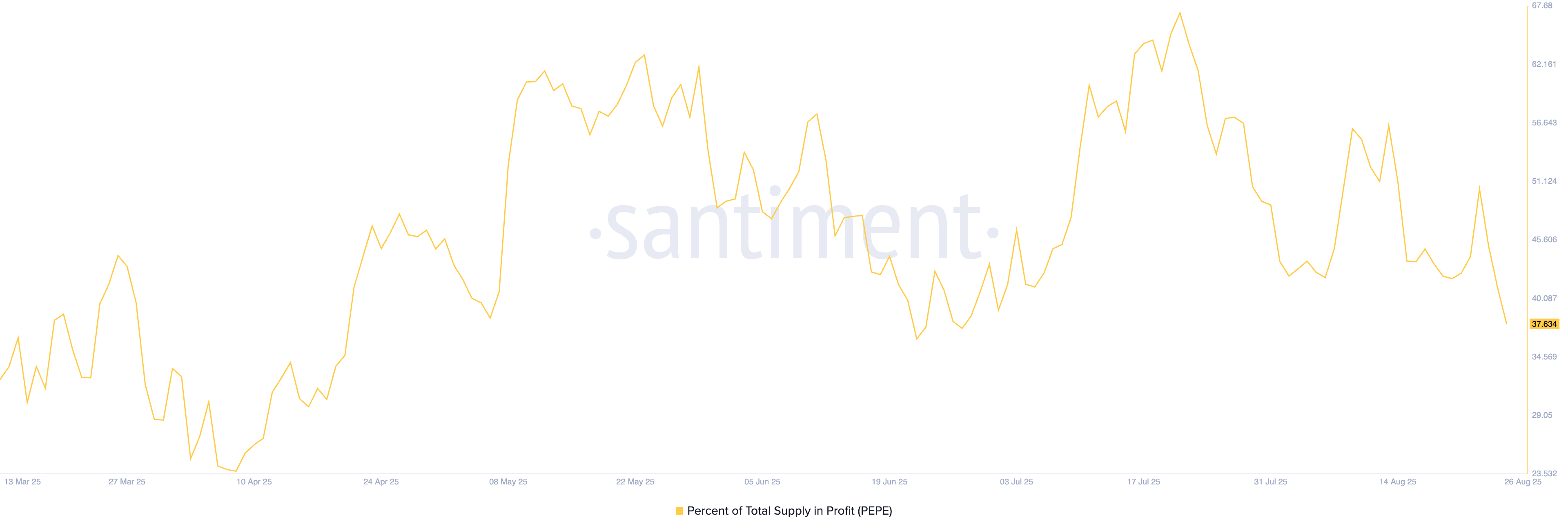 A medida que las ballenas salen, el porcentaje del suministro total en ganancias, tokens comprados a precios inferiores al precio de mercado actual, ha caído a un mínimo de dos meses del 37.63%. Esta disminución en la participación de tokens "en el dinero" resalta una presión creciente de venta.
