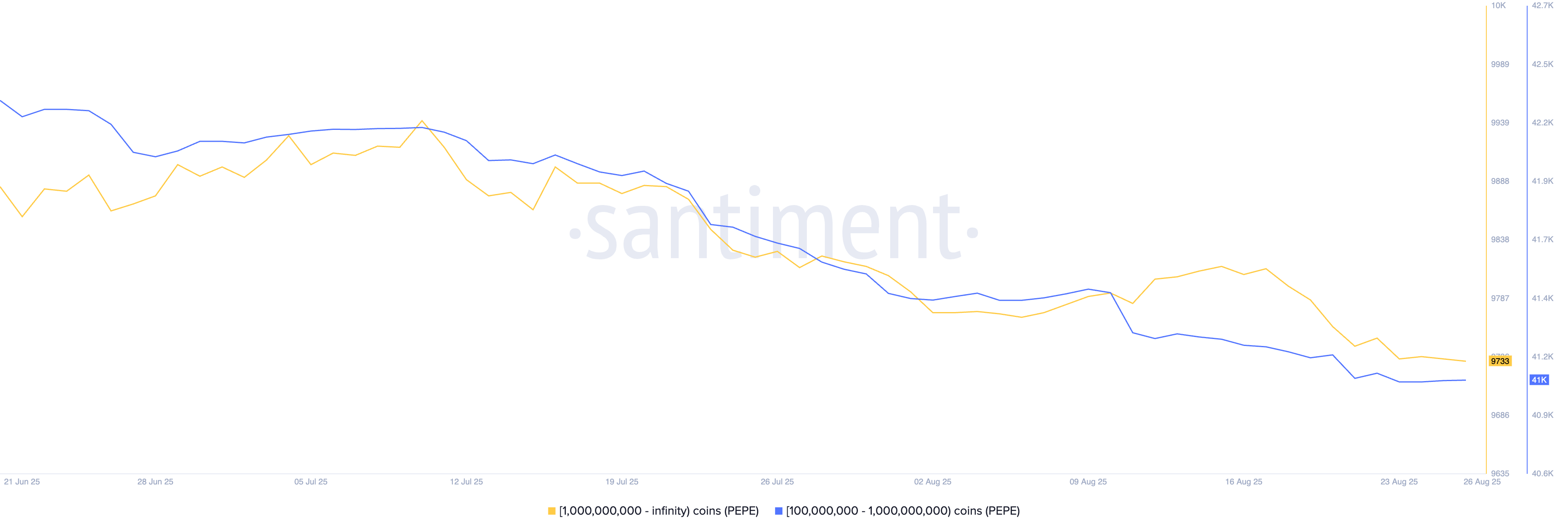 Los datos de Santiment muestran que los grandes inversores en monederos, comúnmente conocidos como ballenas, están disminuyendo en número, lo que es un signo de apoyo reducido por parte de los grandes inversores. La cantidad decreciente de inversores que poseen entre 100 millones y 1 billón de PEPE ha alcanzado 41.058, desde 41.506 (máximo mensual) el 9 de agosto.