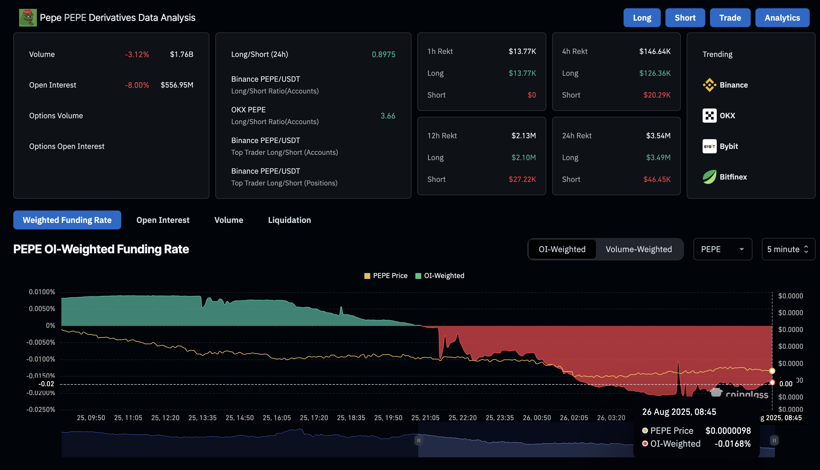Los datos de CoinGlass indican que el interés abierto de PEPE ha disminuido un 8% en las últimas 24 horas, alcanzando los 556.95 millones de dólares. Una salida de capital de tal magnitud, debido a liquidaciones o el cierre de contratos de futuros u opciones de PEPE, sugiere una disminución de la confianza de los inversores, ya que el sentimiento del mercado cambia a una aversión al riesgo.