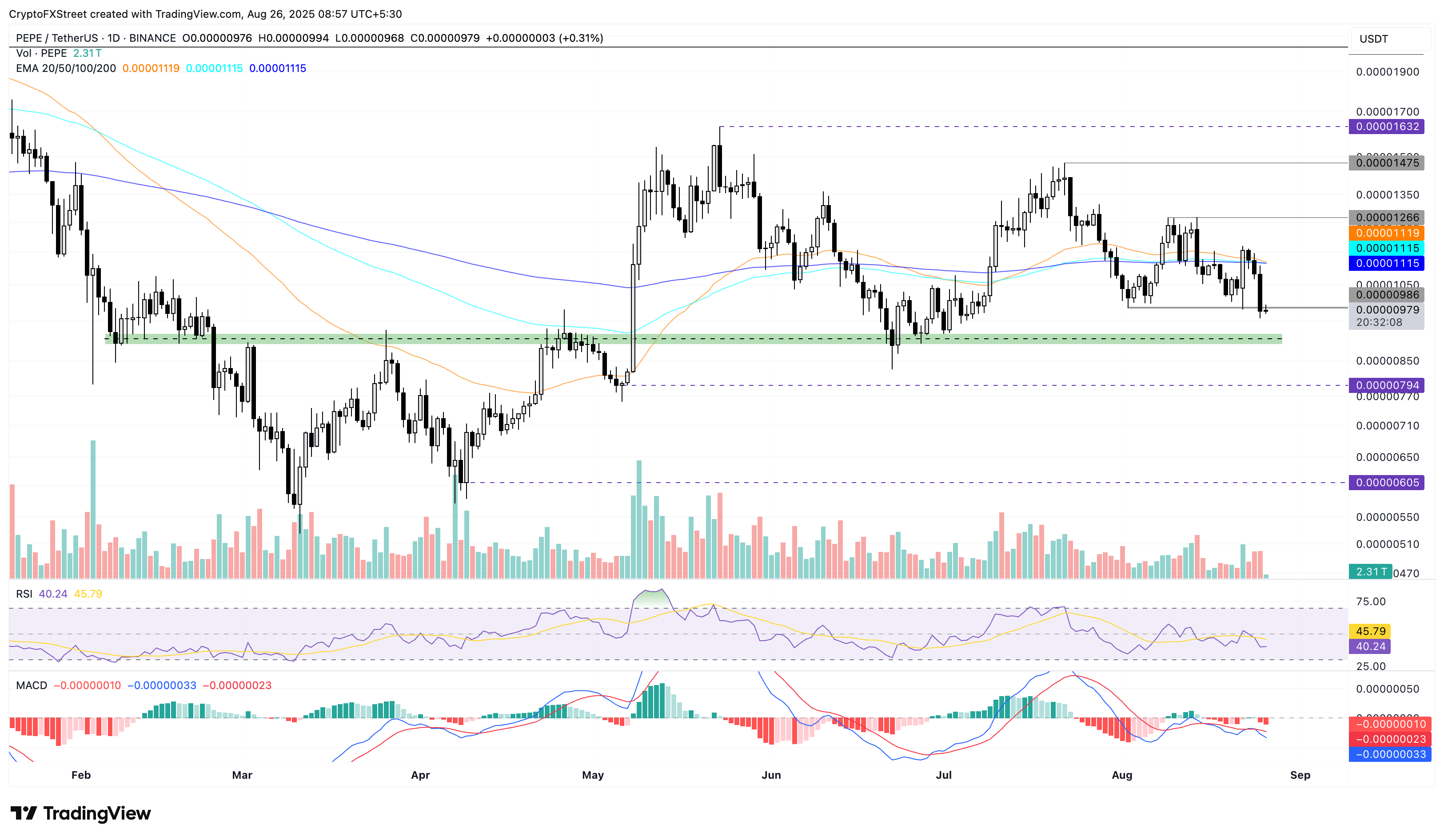 Pepe (PEPE) avanza casi un 1% en el momento de la publicación el martes, tras la caída del 9.88% del lunes. La moneda meme cayó por debajo del nivel psicológico de 0.00001000$ el lunes, con los bajistas anticipando una caída prolongada. Tanto los datos en cadena como los derivados sugieren una debilidad subyacente que podría promover más ventas.