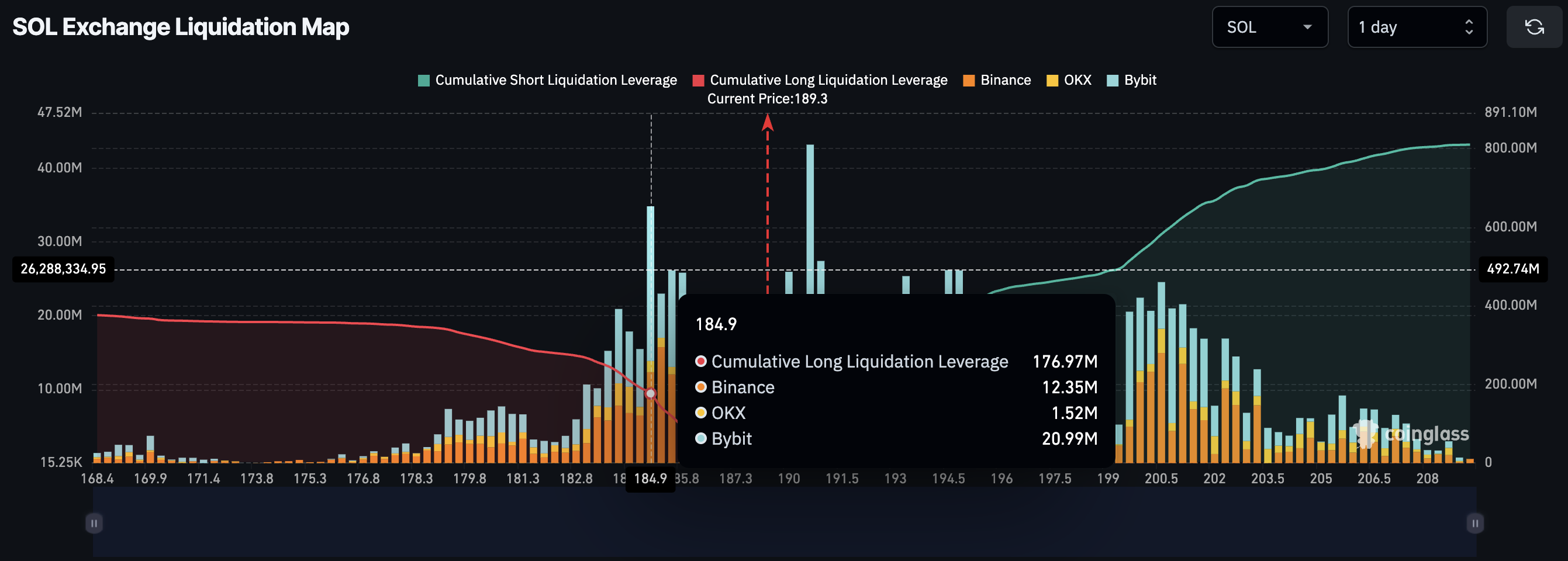 Si la caída de SOL baja de 185$, el mapa de liquidaciones proyecta la posibilidad de 176 millones de dólares en liquidaciones largas acumulativas. Mirando hacia arriba, un apalancamiento de 102 millones de dólares en liquidaciones cortas acumulativas está en riesgo si SOL recupera la marca de 190$.