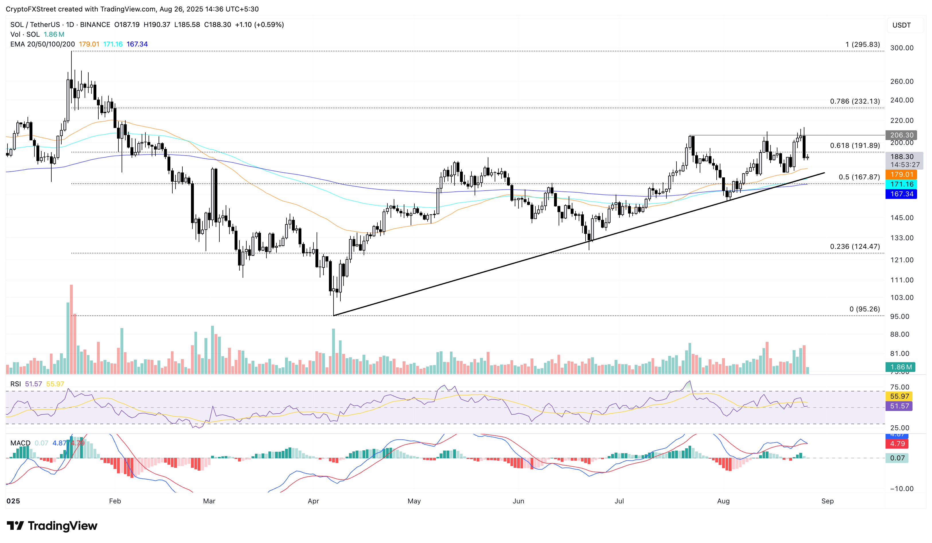 Solana se mantiene actualmente en 188$ en el momento de escribir, presentando una vela en forma de Doji en el gráfico diario. La sexta criptomoneda más grande por capitalización de mercado, SOL, con un valor de 102 mil millones de dólares, está actualmente en un camino de menor resistencia hacia la Media Móvil Exponencial (EMA) de 50 días en 179$.
