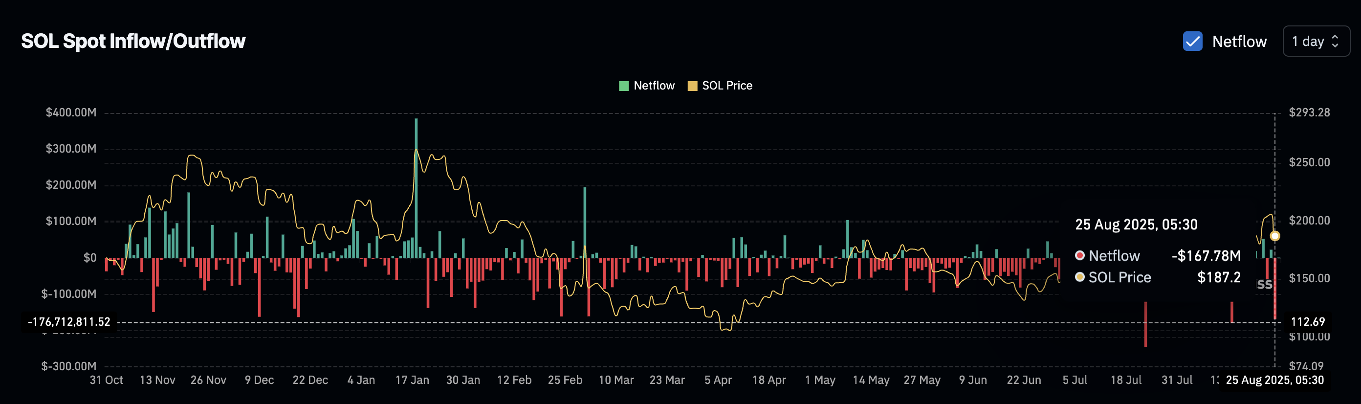 Los datos de CoinGlass muestran una salida neta de Solana de 167.78 millones de dólares el lunes, ya que el colapso del precio al contado alimentó las liquidaciones y obligó a los operadores a retirar tokens. El fuerte aumento en la salida neta alcanzó su tercer nivel más alto en 2025, después de los colapsos repentinos del 23 de julio y el 14 de agosto.