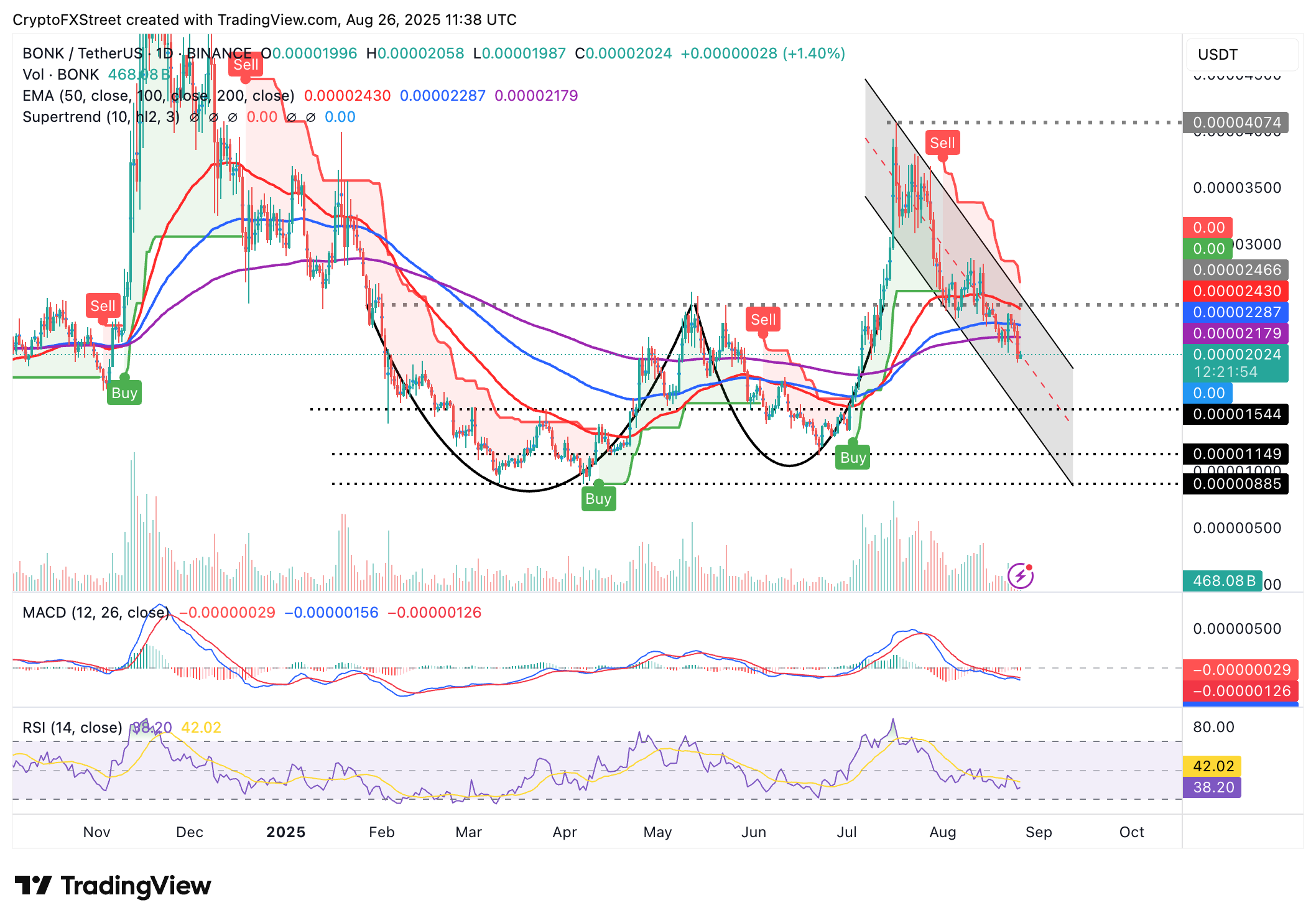 El precio de Bonk se mantiene por encima del soporte a corto plazo en 0.000020$, que coincide con el límite medio de un canal descendente. A pesar de imprimir la primera vela verde tras tres días consecutivos de caídas, múltiples indicadores técnicos muestran señales bajistas.