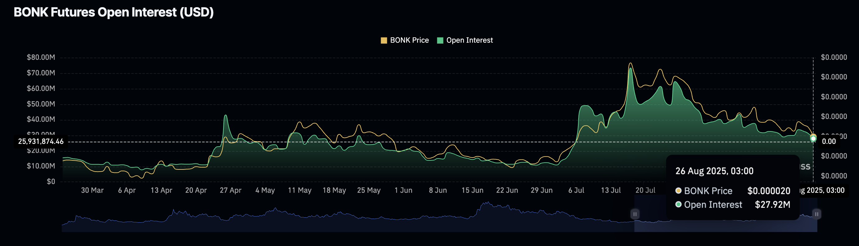 Bonk ha mantenido una tendencia bajista general desde su máximo local de julio, con intentos de recuperación volviéndose cada vez más difíciles de sostener. Una mirada al interés abierto (OI) del mercado de derivados, que representa el valor de los contratos de futuros u opciones pendientes, destaca un sentimiento adverso al riesgo persistente.