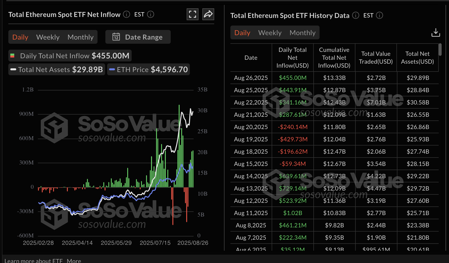 Ethereum, por otro lado, cuenta con una tasa de entrada de ETF al contado más fuerte, con entradas estabilizándose desde el jueves. A pesar de que el precio de ETH alcanzó un nuevo récord de 4.955$, la demanda institucional sigue siendo elevada, respaldada por los 455 millones de dólares en entradas el martes, llevando el total de entradas netas semanales a 899 millones de dólares hasta ahora. Los ETFs de Ethereum experimentaron salidas netas de 238 millones de dólares la semana anterior.