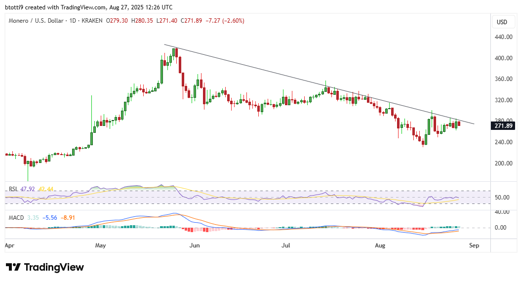 Monero (XMR) cotiza alrededor de $ 272 en el momento de escribir este artículo, ya que el token nativo de la criptomoneda centrada en la privacidad vuelve a alcanzar una resistencia de alrededor de $ 285.