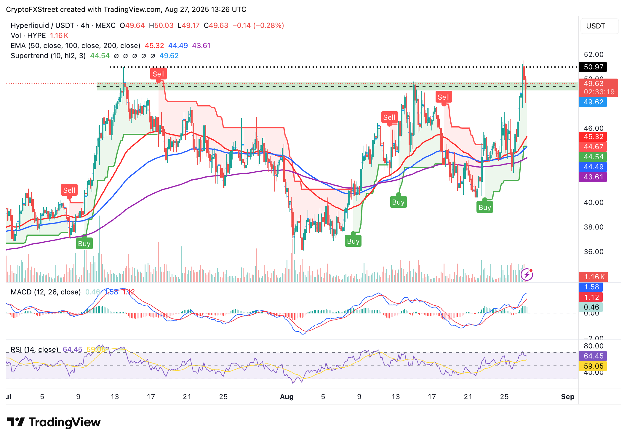 El precio de Hyperliquid se mantiene cerca de su máximo histórico de 51.50$, con soporte a corto plazo en 49.00$, mientras que la zona de oferta en cifras redondas en 50.00$ limita la acción del precio a corto plazo. Una señal de compra del indicador de Convergencia y Divergencia de Medias Móviles (MACD) respalda el caso alcista de HYPE en el gráfico de 4 horas a continuación.