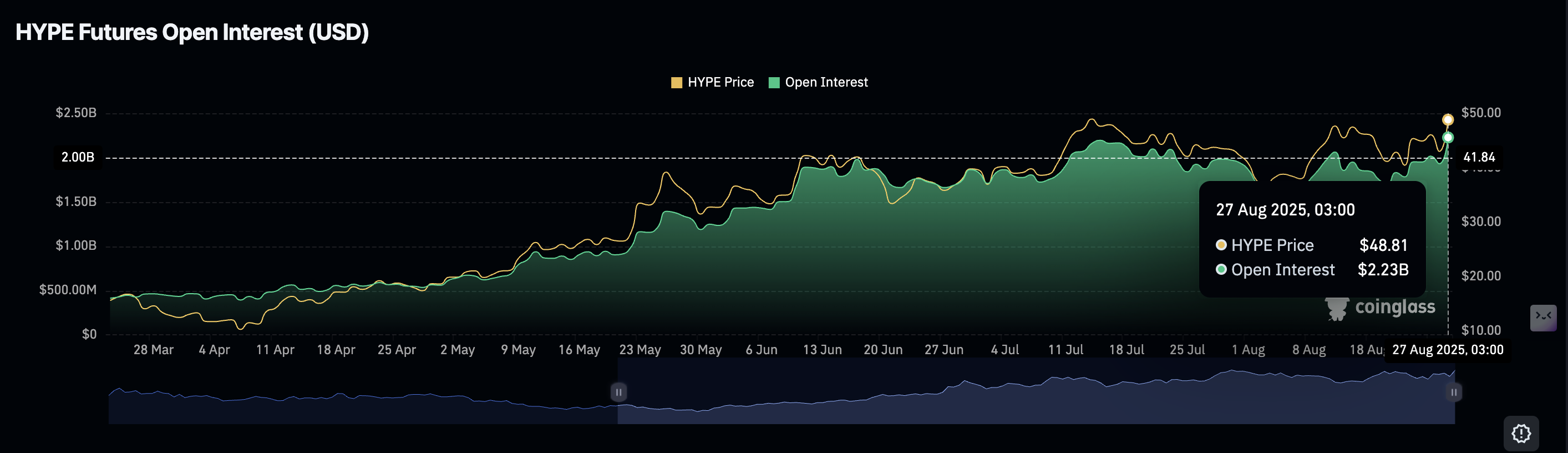 El interés en HYPE sigue siendo significativamente elevado, ya que el token se negocia cerca de su máximo histórico, respaldado por un aumento constante en el interés abierto de futuros (OI). Según datos de CoinGlass, el OI de Hyperliquid, que representa el valor de los contratos de futuros pendientes, se sitúa en 2.23 mil millones de dólares, el nivel más alto registrado.