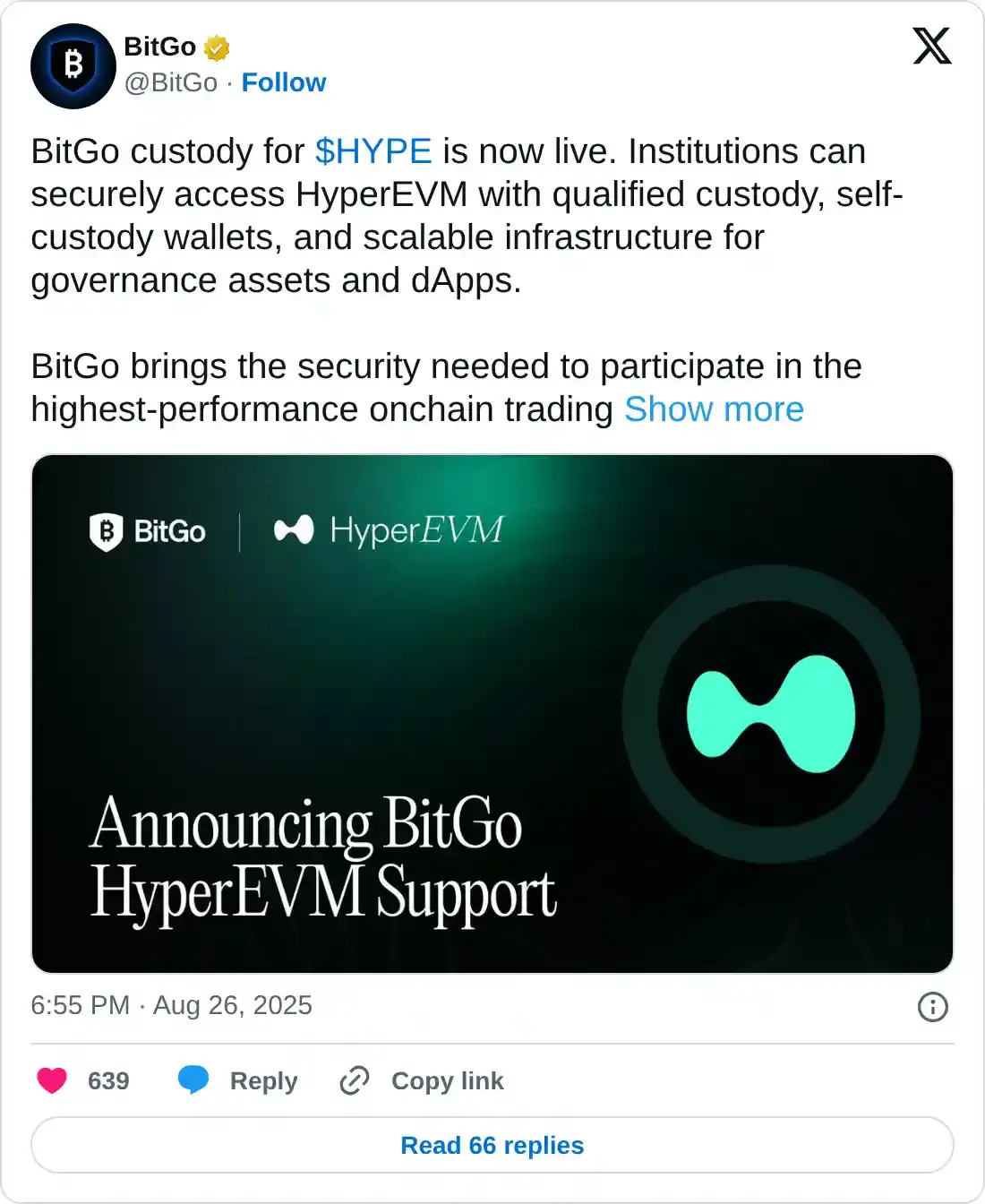 Con este soporte, los usuarios de BitGo pueden acceder a servicios de custodia seguros e interactuar con activos en HyperEVM, incluido el token nativo, HYPE.