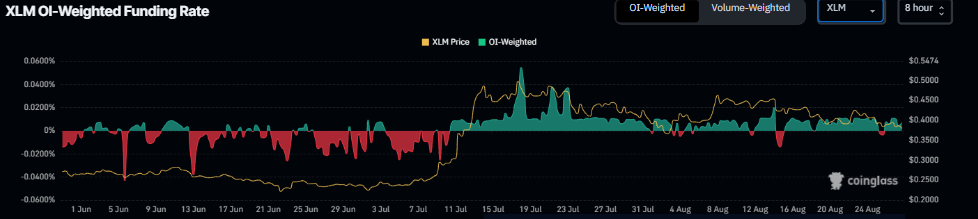 Los datos de la Tasa de Financiación Ponderada por OI de CoinGlass muestran que el número de traders que apuestan a que el precio de Stellar caerá más es menor que el de aquellos que anticipan un aumento del precio.