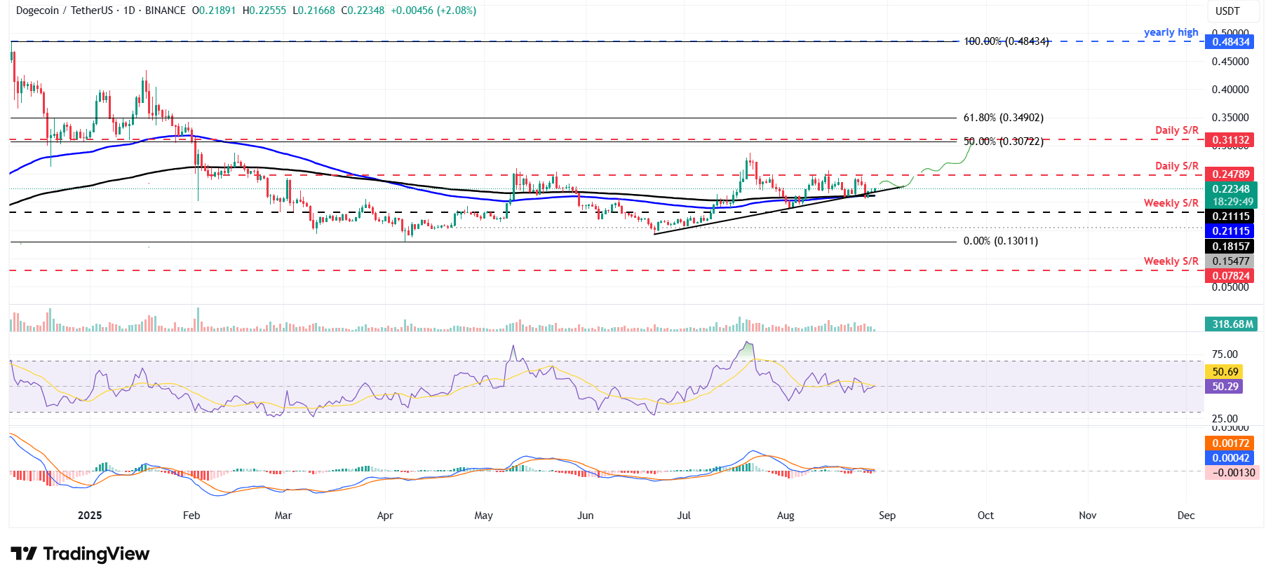 Si el nivel de soporte en 0.211$ continúa manteniéndose, DOGE podría extender la recuperación hacia su resistencia diaria en 0.247$.