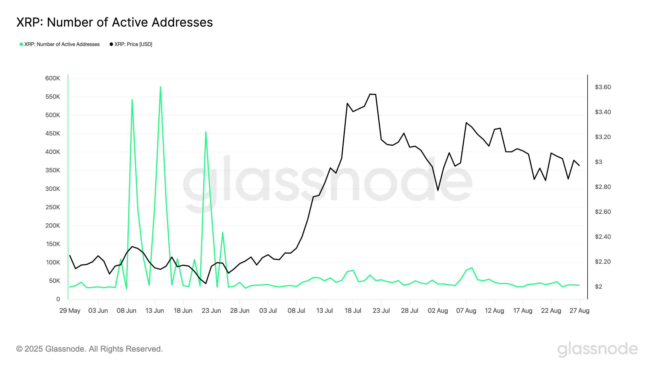 Desde finales de julio la actividad se mantiene estable pero baja, incluso cuando XRP llegó a tocar los $3,40 a inicios de agosto. Una subida sana suele acompañarse de mayor uso de red, pero aquí ese soporte no se ve.