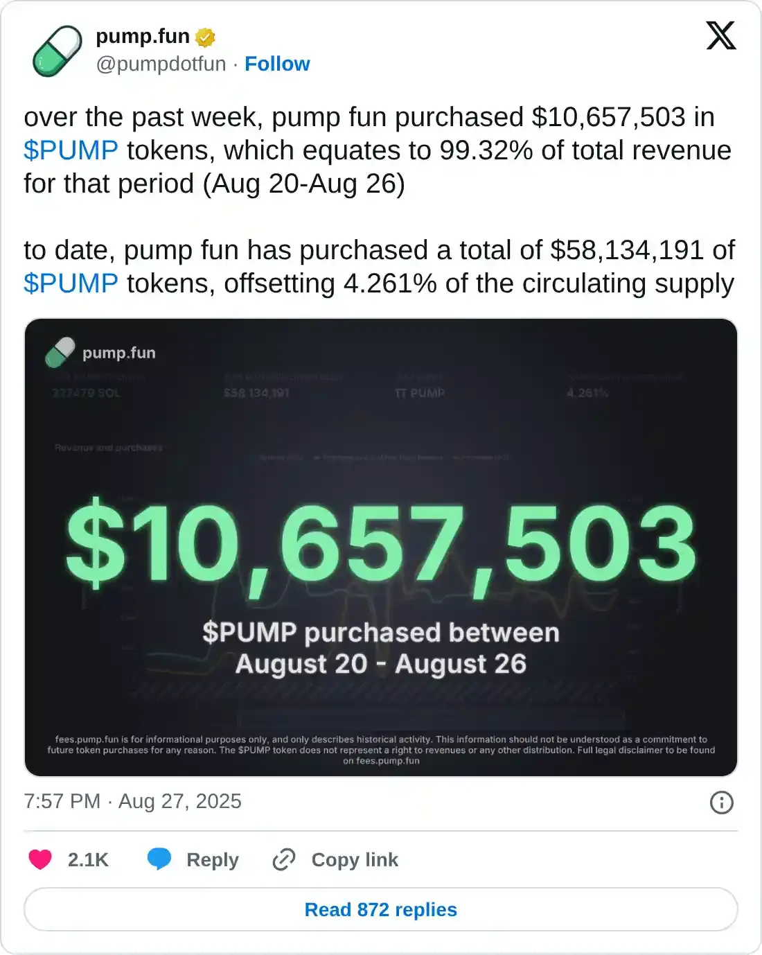 Pump.fun gana tracción después de gastar el 99.32% de los ingresos desde el 22 de agosto hasta el 26 de agosto para adquirir 10.65 millones de tokens PUMP. Esto aumentó las tenencias a 58.13 millones de dólares, lo que compensa más del 4% de la oferta en circulación de tokens.