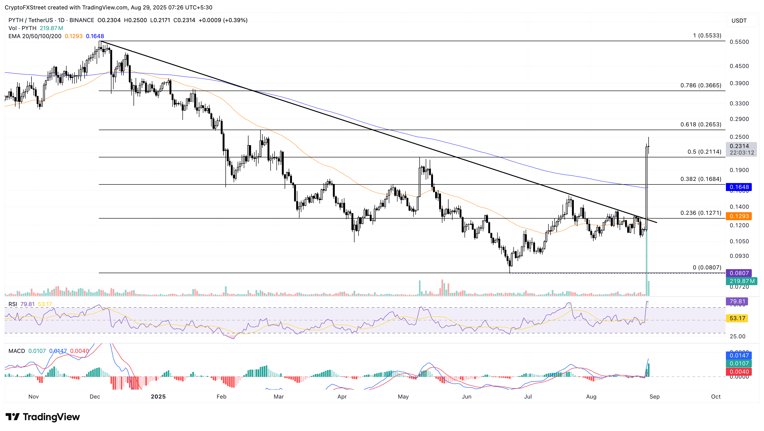 Por el contrario, si PYTH retrocede por debajo del nivel de retroceso del 50% en 0.2114$, podría caer al nivel de Fibonacci del 38.2% en 0.1664$.