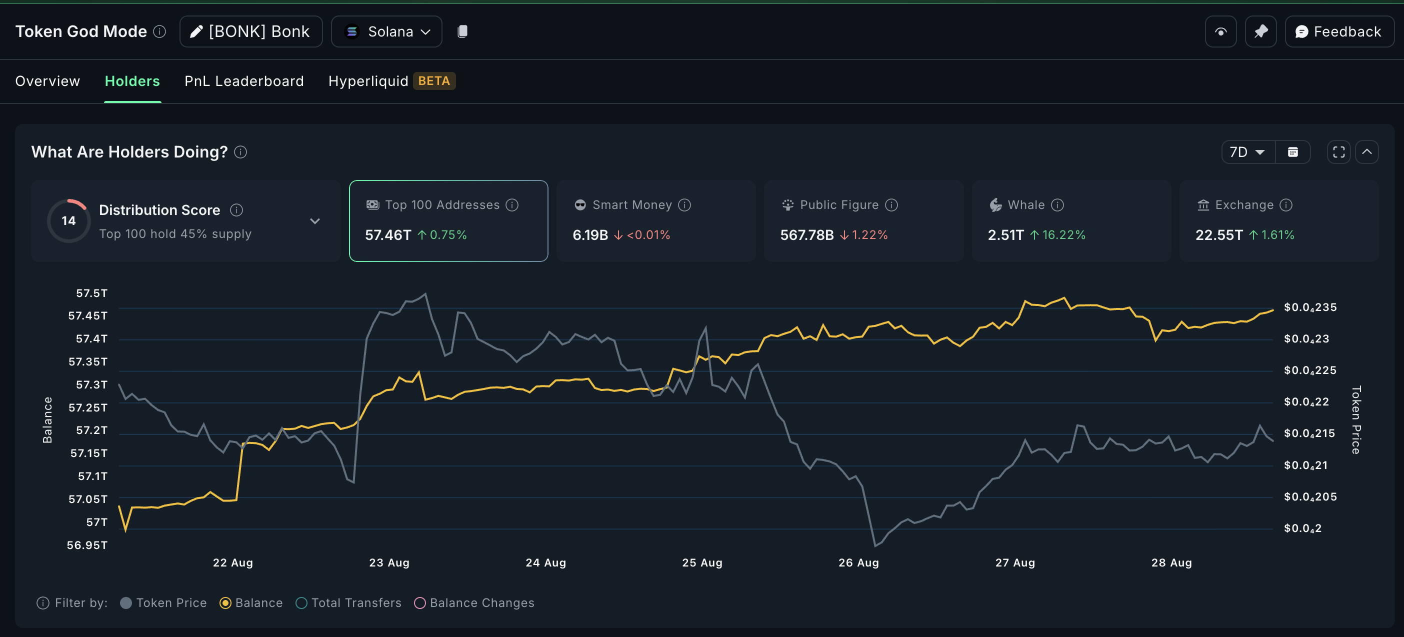 Al mismo tiempo, los exchanges vieron salidas del 1.61%, mostrando que el trading minorista continúa vendiendo mientras las ballenas acumulan. Esta divergencia a menudo precede movimientos más fuertes, y es una razón clave por la que BONK es una de las memecoins a observar en septiembre.