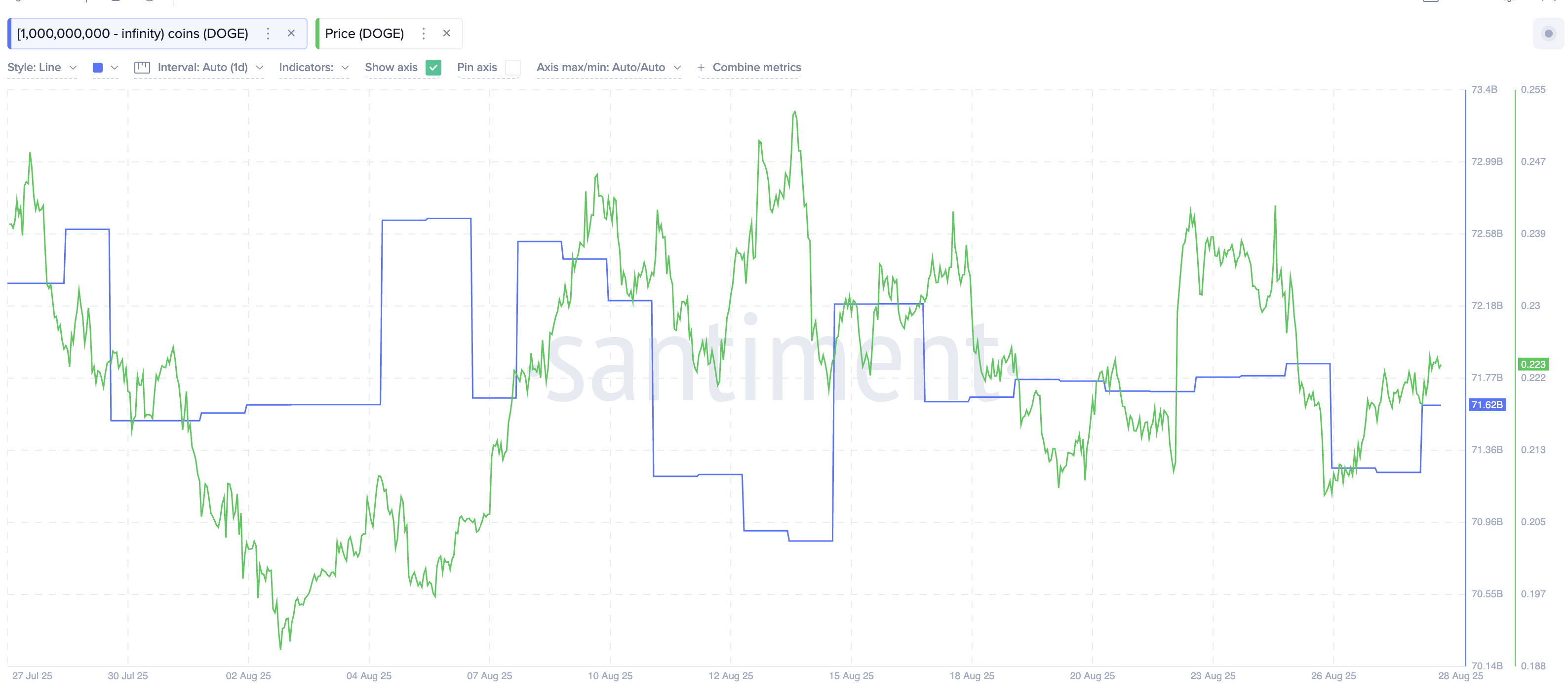 Los grandes holders han tomado nota. Entre el 27 y el 28 de agosto, los mega monederos (1 mil millones de DOGE o más) aumentaron sus saldos de 71,24 mil millones a 71,62 mil millones de DOGE — un aumento del 0.53%, valorado en alrededor de 84 millones de dólares a 0.2230 dólares.