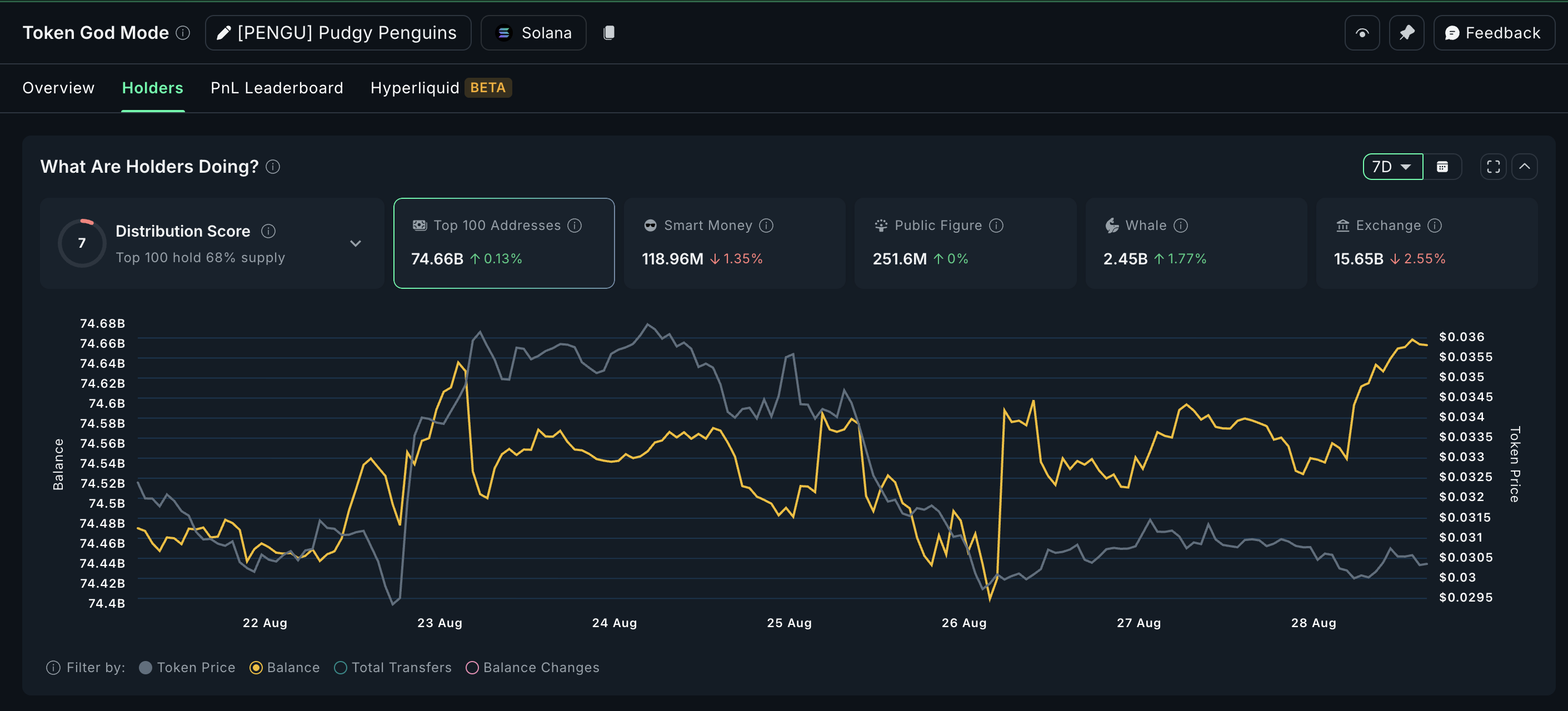 Sus balances crecieron 1.77% a 2,45 mil millones de PENGU, mientras que las 100 direcciones principales añadieron 0.13% para alcanzar 74,66 mil millones. A 0.030 dólares, estas adiciones de grandes holders están valoradas en 4.2 millones de dólares.