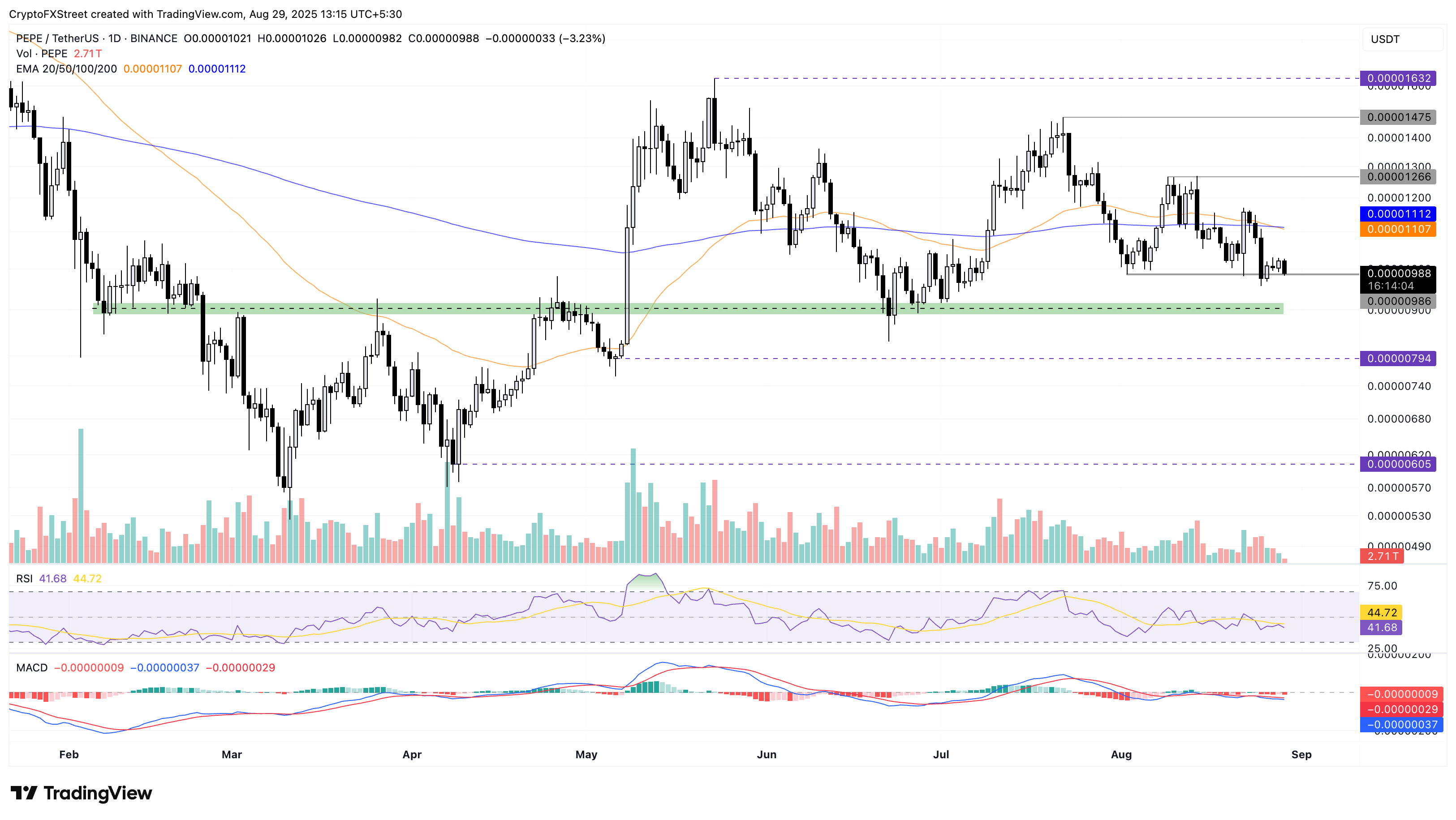 Si PEPE pierde el nivel de soporte de 0.00000988$ con un cierre diario decisivo, podría volver a probar la zona de demanda de 0.00000900$.