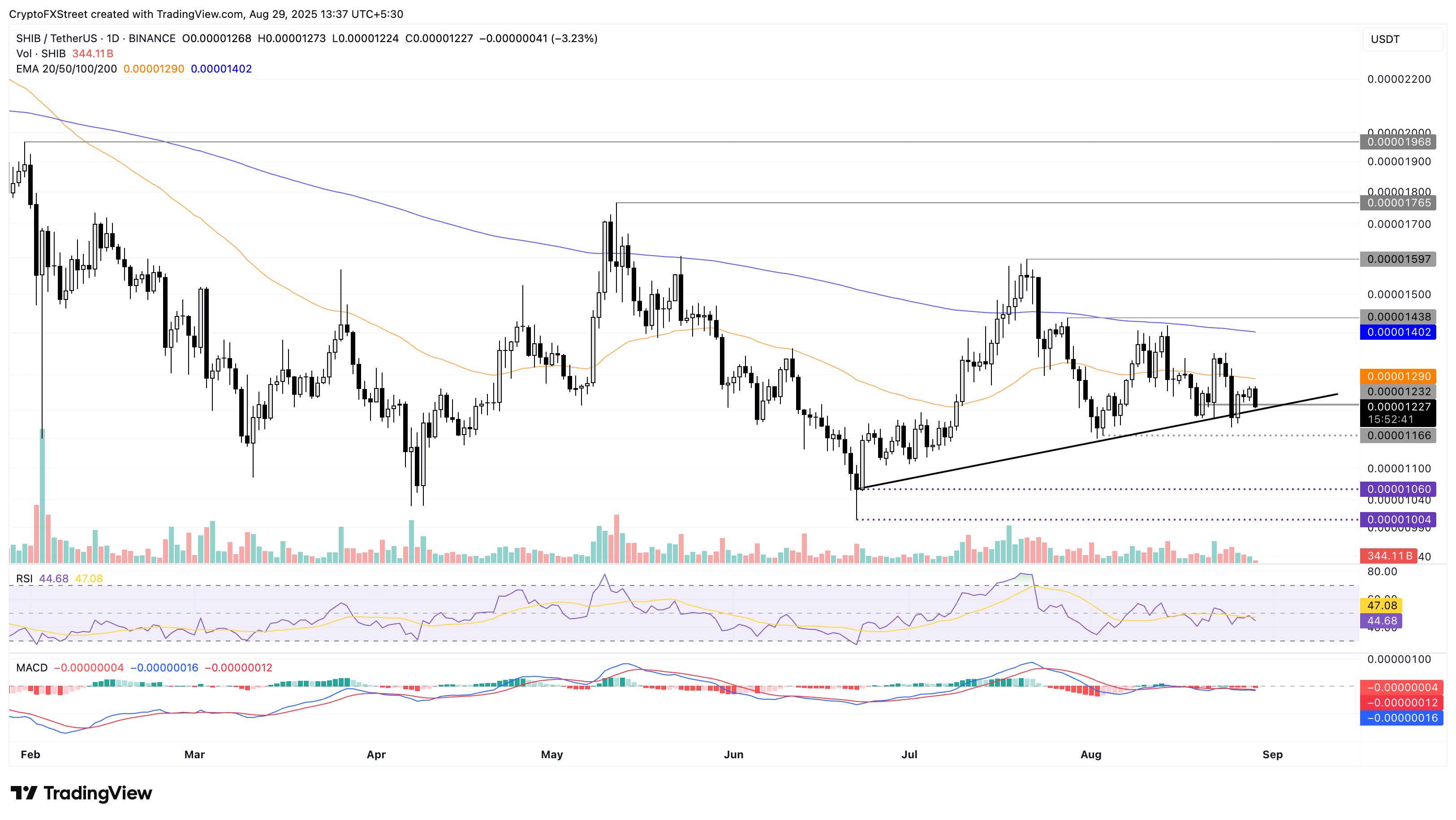 Shiba Inu se desliza más de un 3% en el momento de la publicación el viernes, probando una línea de tendencia de soporte formada al conectar los precios de cierre del 22 de junio y el 25 de agosto. La moneda meme corre el riesgo de una corrección más pronunciada si marca un empuje limpio por debajo de esta línea de tendencia.