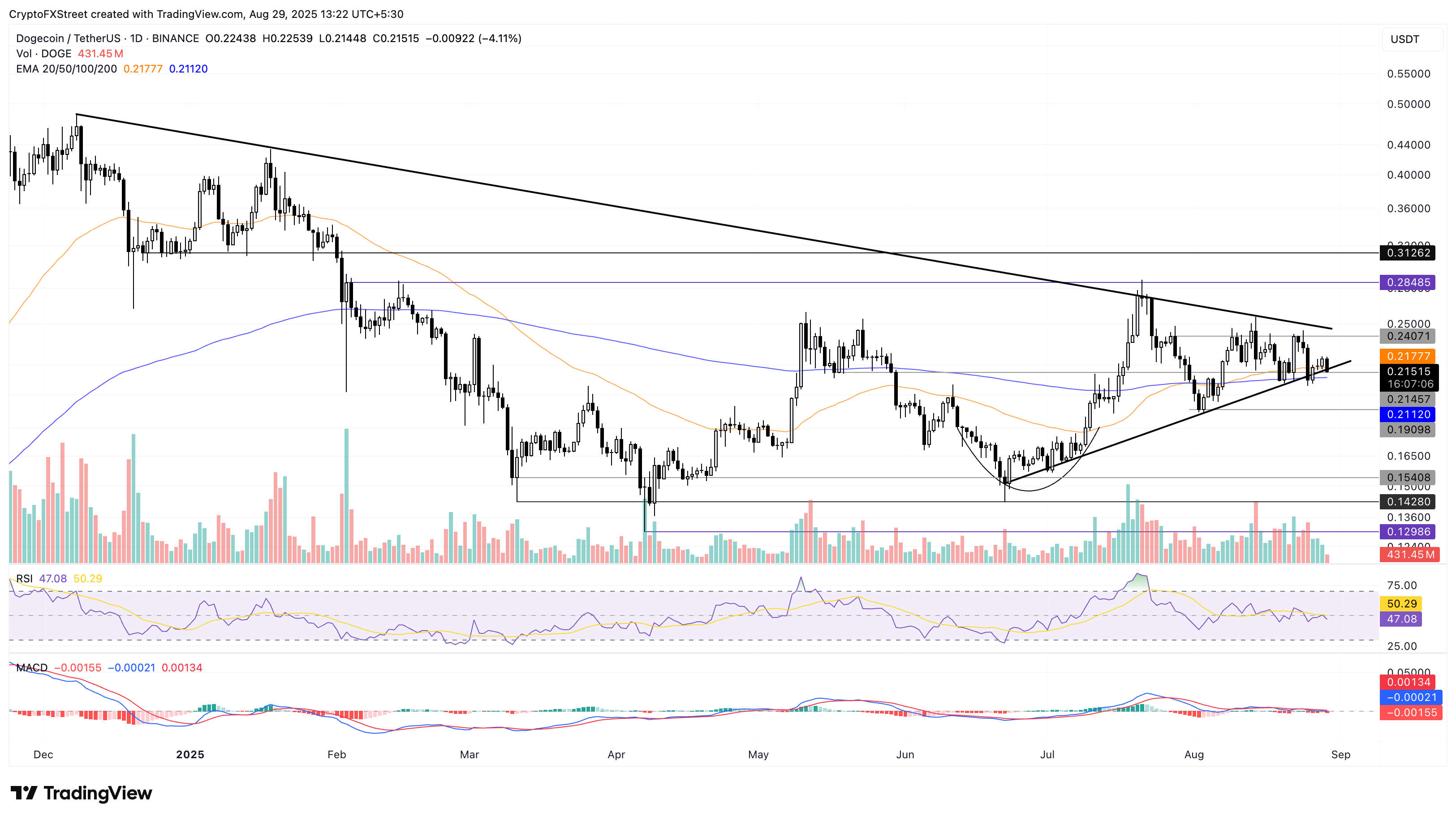 Un cierre potencial por debajo de esta línea media dinámica rompería una línea de tendencia de soporte ascendente, marcando la caída de un patrón de triángulo simétrico. En tal caso, DOGE podría romper la EMA de 200 días para volver a probar el nivel de 0.1909$, que fue probado por última vez el 3 de agosto.