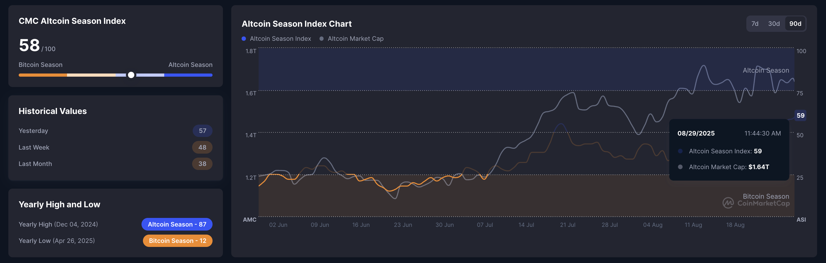 La tasa de interés reducida podría retrasar el rebote en las monedas meme, mientras que el mercado muestra signos crecientes de una posible temporada de altcoins en carga. El Índice de Temporada de Altcoins de CoinMarketCap muestra que la puntuación de la temporada de altcoins ha subido a 59, el más alto en los últimos tres meses. La Temporada de Altcoins comienza cuando este índice supera el nivel de 75.