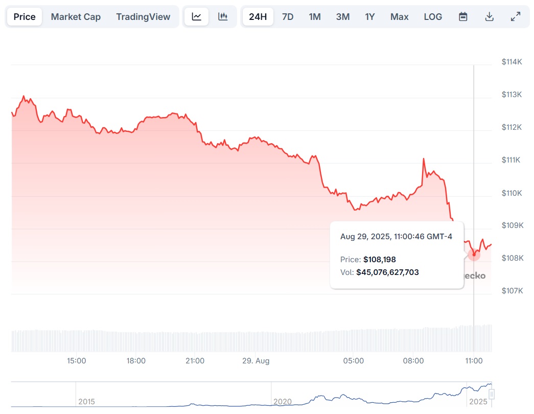 La mayor y más antigua criptomoneda se revirtió a un mínimo local de USD $108.104, su nivel más bajo desde principios de julio, según datos de CoinGecko. Esta corrección representa una caída del 3,5% en las últimas 24 horas, con el precio de BTC situándose en USD $108.500 al momento de redacción, un 12,5% por debajo desde su máximo histórico de USD $124.128 alcanzado el 14 de agosto.
