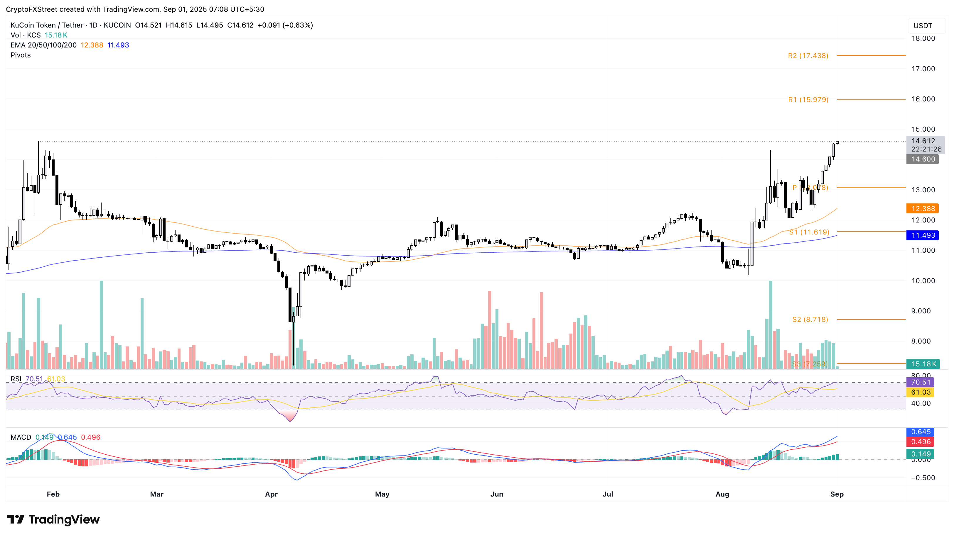 El token de KuCoin alcanzó un nuevo máximo anual de 14.61$ el lunes, mientras la tendencia alcista continúa por séptimo día. La carrera alcista en KCS entra en modo de descubrimiento de precios, con los alcistas apuntando al nivel de pivote R1 en 15.97$ a medida que la tendencia alcista gana impulso.