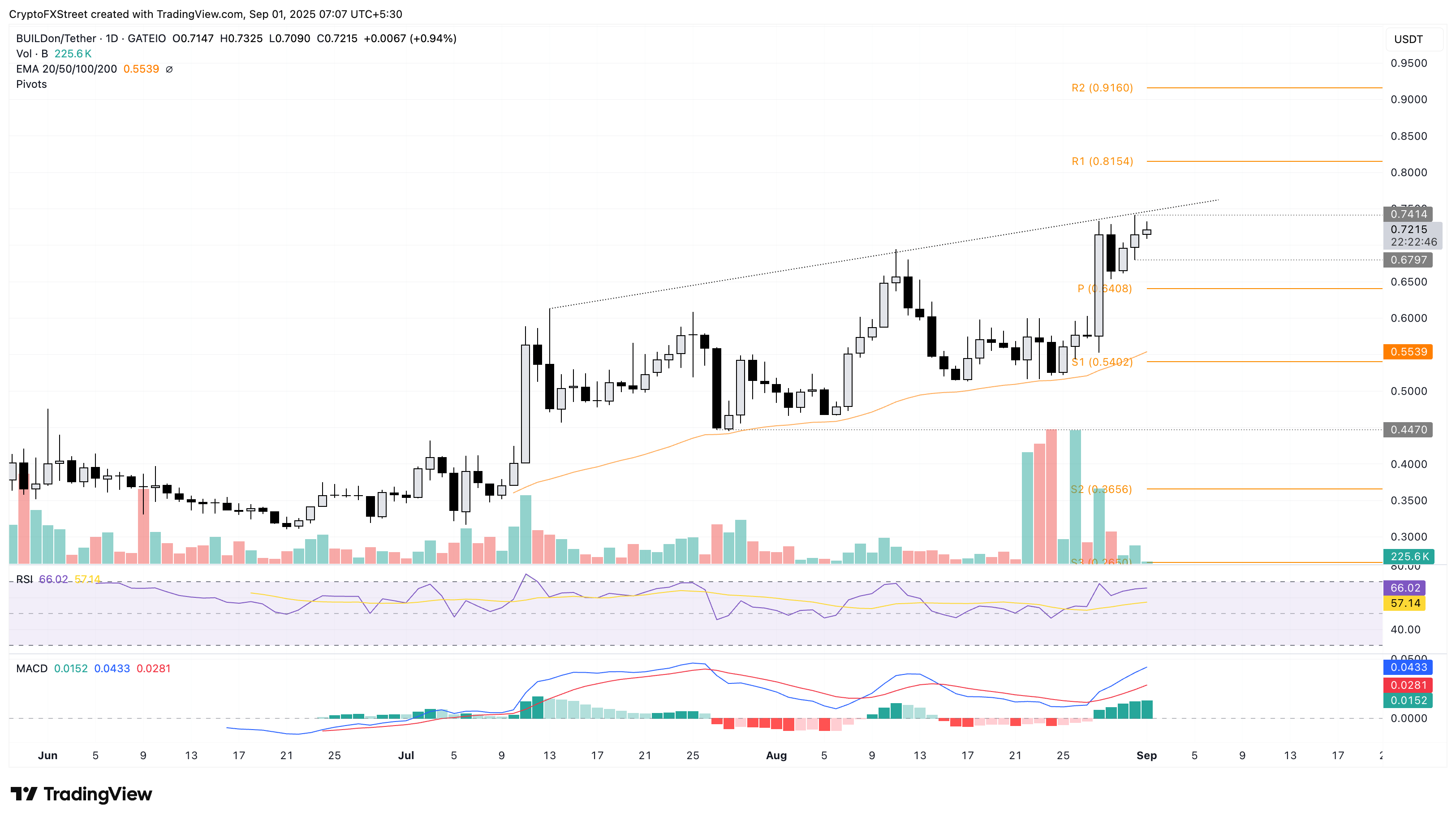 BUILDon extiende la tendencia alcista en casi un 1% en el momento de la publicación el lunes, desafiando una línea de tendencia ascendente en el gráfico diario, formada al conectar los picos del 13 de julio y el 28 de agosto. La moneda meme revirtió desde la línea de tendencia en 0.7414$ el domingo, sugiriendo presión en la parte superior.