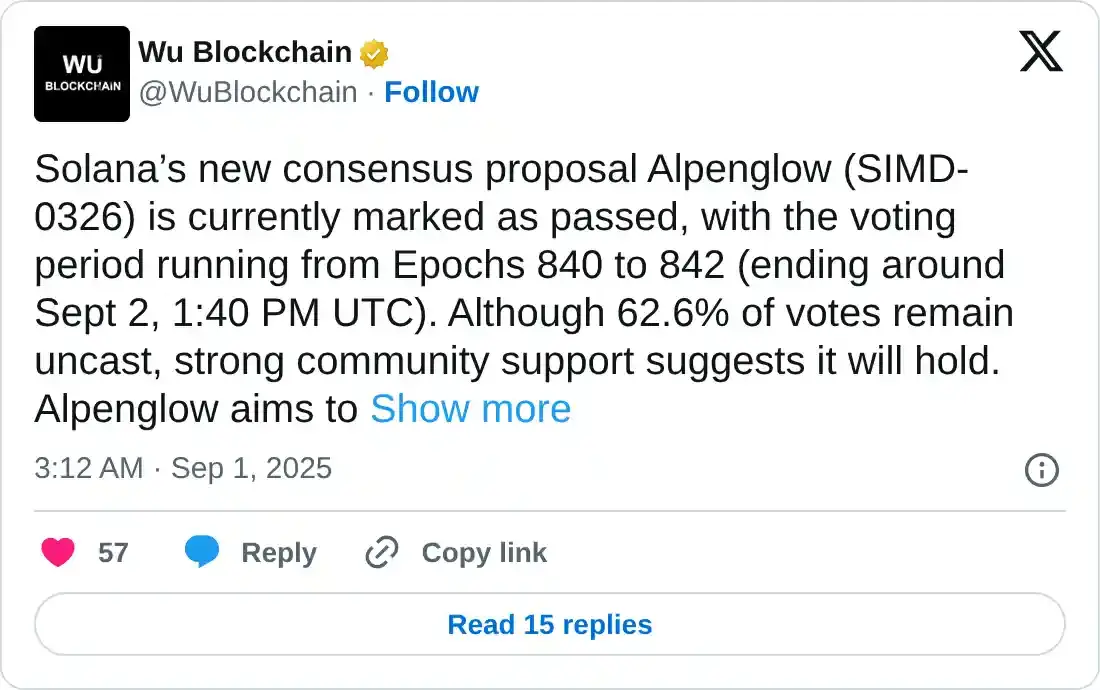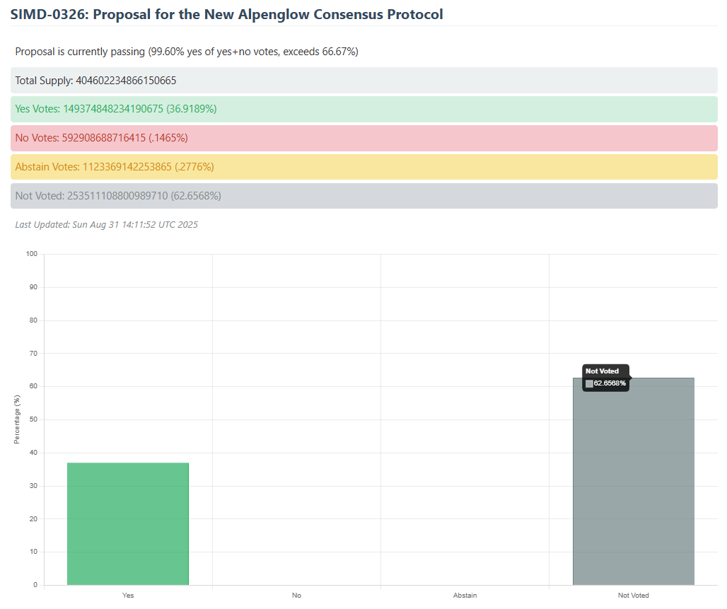 Según los datos de Wu Blockchain el lunes, la nueva propuesta de consenso de Solana, Alpenglow (SIMD-0326), está actualmente marcada como aprobada, con el período de votación que va de las Épocas 840 a 842 y se espera que concluya alrededor del martes.