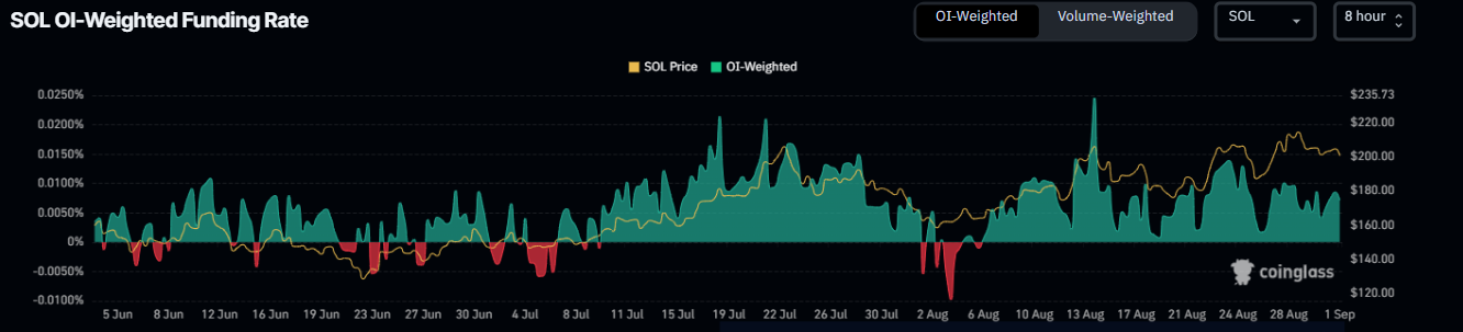 Aparte del optimismo que se está construyendo en torno a la actualización de la red, la tasa de financiación de Solana se mantiene positiva, en 0.0071% el lunes, lo que indica que los largos están pagando a los cortos y destaca el sentimiento alcista en curso.