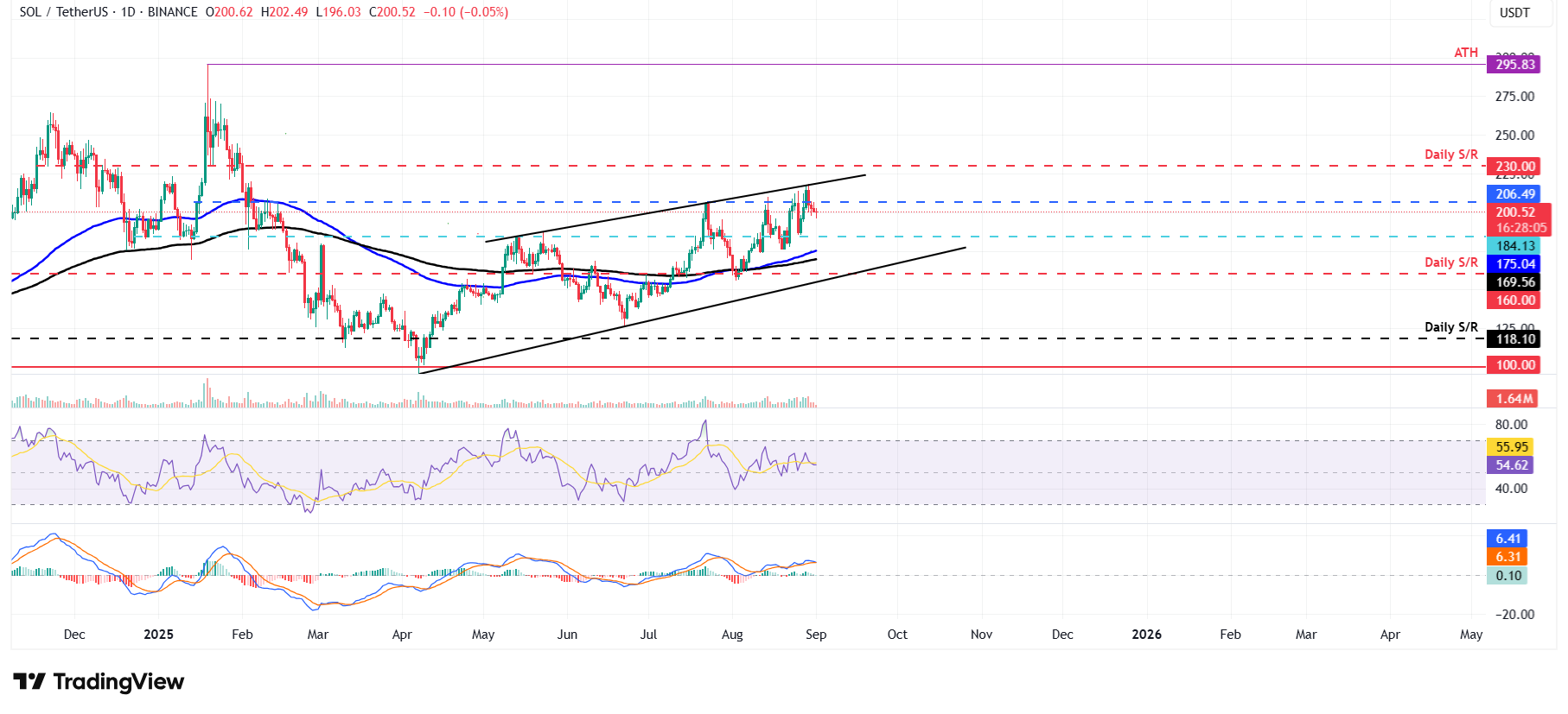 El precio de Solana fue rechazado de la línea de tendencia superior de un canal paralelo (dibujado uniendo múltiples máximos y mínimos desde mediados de abril) el viernes y cayó un 6.38% hasta el domingo. En el momento de escribir el lunes, se estabiliza alrededor de 200$.