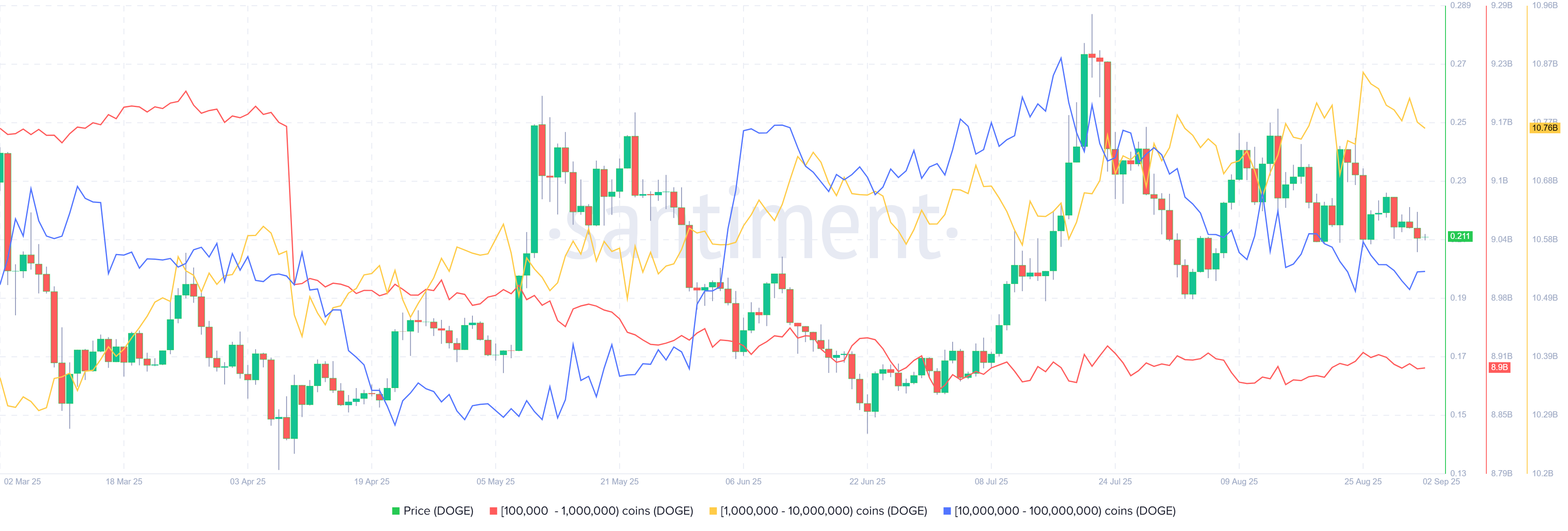 La métrica muestra que las ballenas que poseen entre 100.000 y 1 millón de tokens DOGE (línea roja), de 1 millón a 10 millones (línea amarilla) y de 10 millones a 100 millones (línea azul) han vendido un total de 250 millones de tokens DOGE desde el 25 de agosto, apoyando la visión bajista.