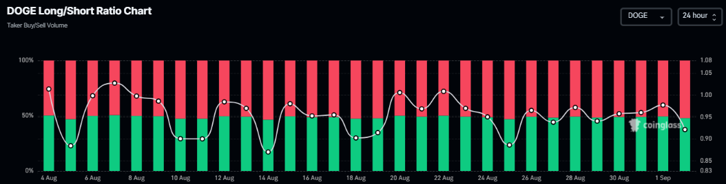 Aparte de las tasas de financiación negativas, la relación largo-corto para DOGE también sugiere un sentimiento bajista a medida que las apuestas cortas están aumentando entre los operadores.