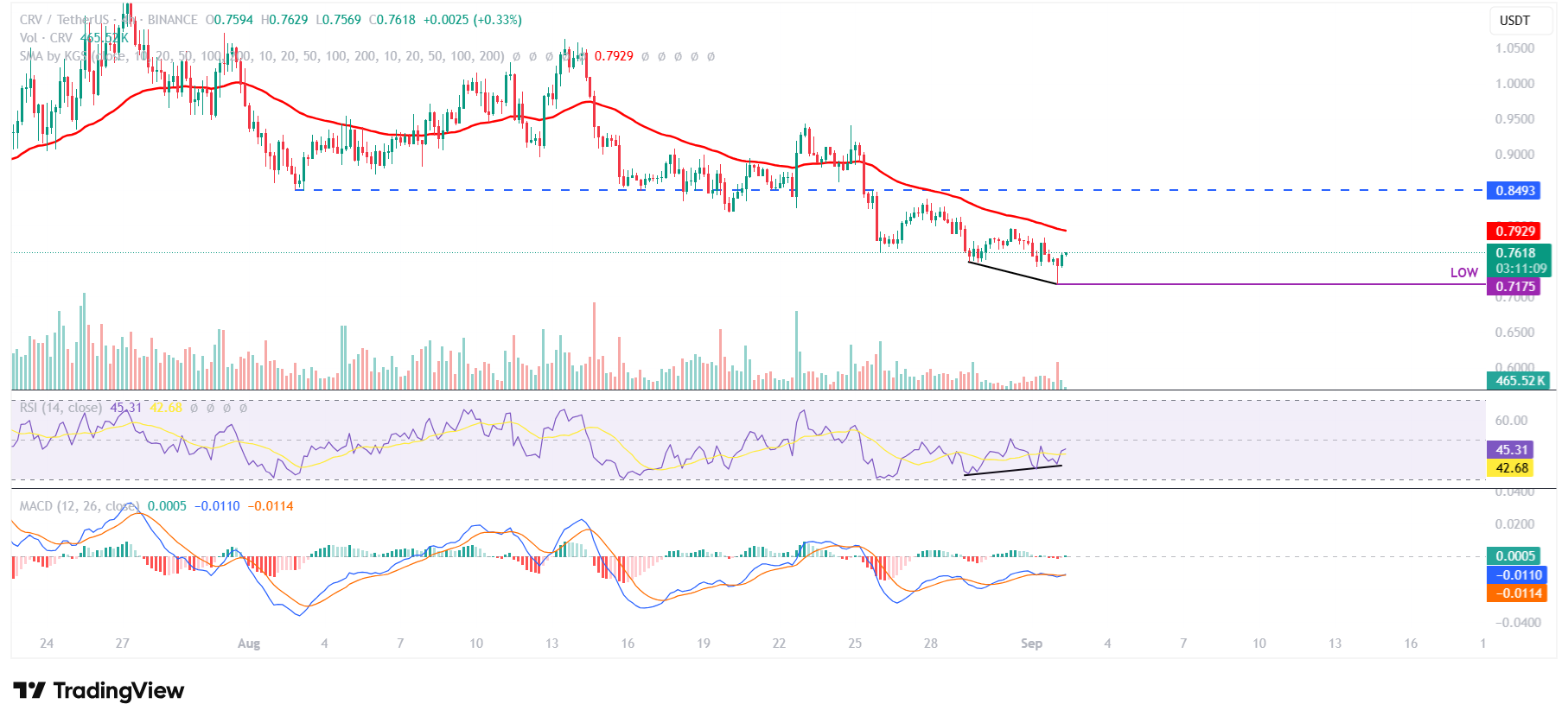 Curve DAO no logró cerrar por encima del nivel de resistencia diario en 0.81$ el 27 de agosto y cayó un 8.6% hasta el lunes, volviendo a probar su EMA de 200 días en 0.71$. En el momento de escribir el martes, CRV rebota, negociando por encima de 0.75$.