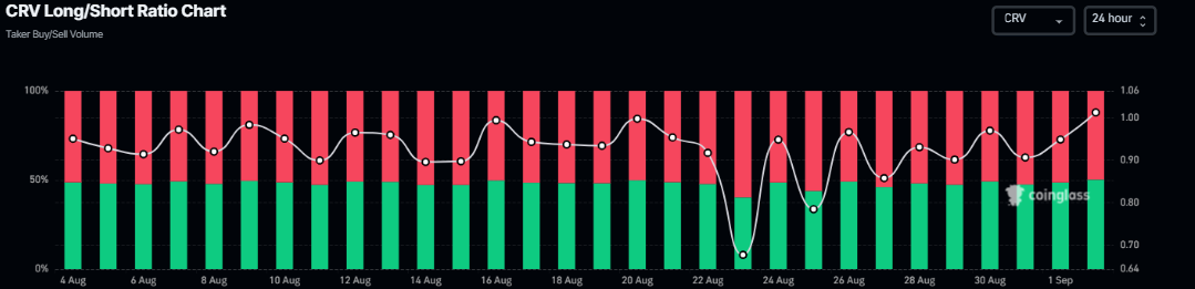 Mirando los datos de derivados, se respalda aún más la perspectiva alcista. La relación larga-corta de Coinglass para CRV lee 1.01 el martes, casi su máximo mensual, sugiriendo que los comerciantes están apostando a que el precio del activo suba.